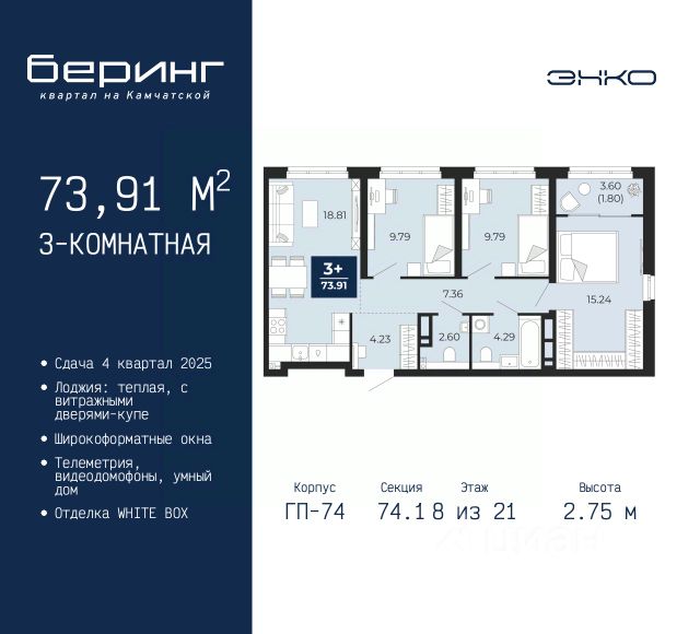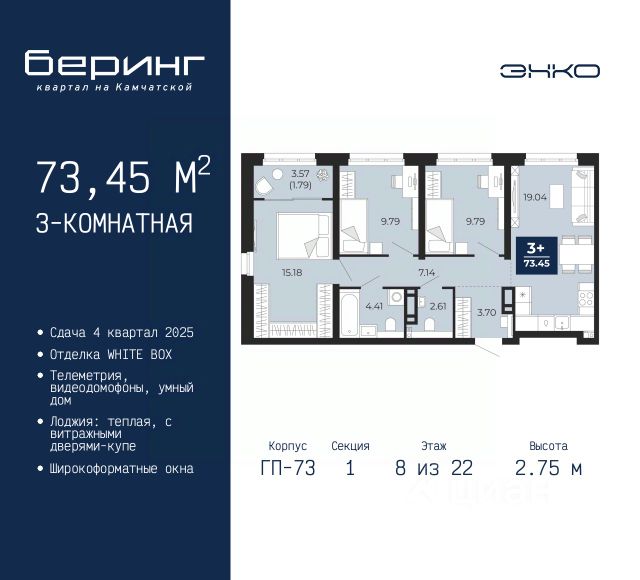 Трехкомнатная квартира от застройщика в ЖК "Беринг" на 8 этаже. Квартира без отделки, полностью готова к чистовой отделке и дальнейшему ремонту. Общая площадь: 73.45 кв.м., жилая: 34.76 кв.м., площадь просторной кухни-столовой: 19.04 кв.м. Квартира угловая, очень светлая, естественная вентиляция при открытии окон. В квартире одна лоджия, один совмещенный и один раздельный санузел. Высота потолков 2.75 м. Дом монолитный, многоподъездный, переменной этажности, от 9 до 22 этажей. Квартира находится в 1-й секции высотой 22 этажа в корпусе ГП-73. На этаже 5 квартир. В подъезде 1 пассажирский и 1 грузовой лифт. Окончание строительства - 4 квартал 2025 года. Оформление сделки по договору долевого участия. Подобно знаменитому исследователю, мы чувствуем себя первооткрывателями этой локации. Хотим показать новую суть места, сформировать для вас жизненный опыт, которого ещё не было. Беринг — район зелёного цвета. Беринг — район, который откроется вам с другой стороны. Впечатлит новым уровнем комфорта и качеством жизни. Беринг — открытие на карте города. Первый квартал расположен в районе Тура, в границах улиц: Камчатская Западносибирская Энтузиастов. Вокруг уже есть всё для того, чтобы ежедневная рутина была лишь частью жизни и не доставляла дискомфорта. Школы и детские сады, магазины и аптеки, поликлиника, места для семейного отдыха, пеших и велопрогулок, и даже рыбалки. Масштабное озеленение дворов — визитная карточка ЭНКО и ваш оазис спокойствия, чтобы отвлечься от повседневности. Раскидистые деревья, кустарники, травы и цветы — осталось остановиться, вдохнуть и расслабиться, глядя на эту природную красоту. Стилистика подъездов продолжает концепцию Беринга, вдохновлённого Камчаткой: сдержанный, но при этом впечатляющий дизайн соседствует с удобством и функциональностью. #ZSFmwB