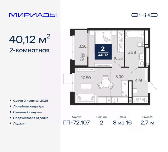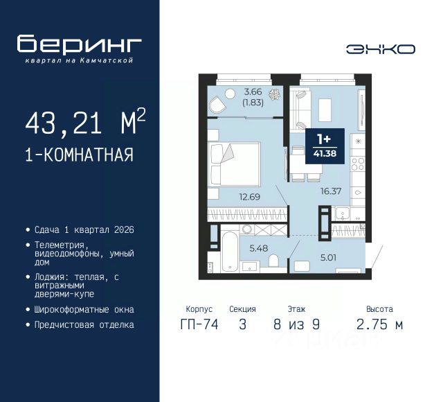 Дом монолитный, многоподъездный, переменной этажности, от 7 до 16 этажей. Квартира находится в 5-й секции высотой 8 этажей в корпусе 1. На этаже 6 квартир. В подъезде 1 грузовой лифт. Окончание строительства - 4 квартал 2026 года. Оформление сделки по договору долевого участия.