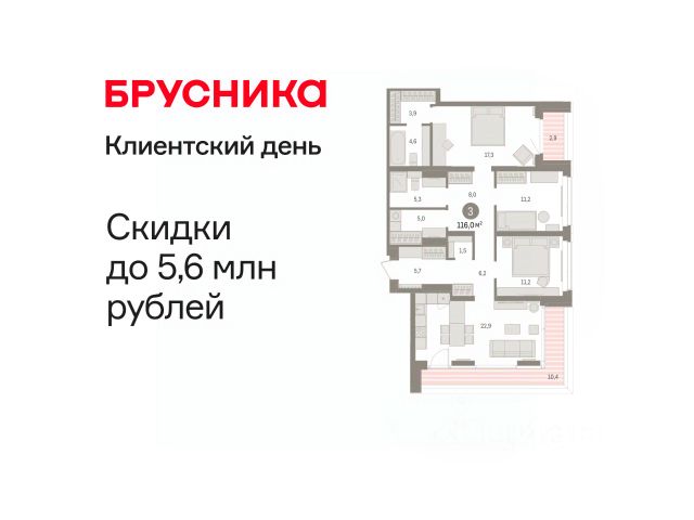 3-комн. квартира от застройщика с предчистовой отделкой в Кварталы "На Минской" на 9 этаже. Общая площадь: 116 кв.м., жилая: 39.7 кв.м., площадь просторной кухни-гостиной: 22.9 кв.м. Угловая квартира, окна oбecпeчивaют paвнoмepнoe ocвeщeниe в тeчeниe дня. В квартире один балкон и одна лоджия, два совмещенных санузла. Терраса представляет собой роскошную зону отдыха, где вы на свой вкус можете создать атмосферу комфорта и уюта. Высота потолков 2.7 м. Дом монолитный, многоподъездный, переменной этажности, от 7 до 16 этажей. Квартира находится в 1-й секции высотой 16 этажей в корпусе 1. На этаже 8 квартир. В подъезде 2 пассажирских лифта. Окончание строительства - 4 квартал 2026 года. Оформление сделки по договору долевого участия. Квартира с кухней-гостиной и тремя спальнями в кварталах "На Минской". Особенности планировки: предчистовая отделка. квартиры в нашей базе: МНС01-Ж1.9.1. В сердце города Кварталы "На Минской" находятся в самом центре. За десять минут можно дойти до площади 400-летия Тюмени и Большого Драматического театра, Тюменского индустриального и медицинского университетов, спортивного комплекса "Строймаш", ТРЦ "Гудвин" и "Премьер", Тюменского технопарка. Поблизости много детских садов, школ и поликлиник. Пространство разного опыта Создавая кварталы "На Минской" мы вдохновлялись Хакскими дворами в Берлине и улицей Давида Агмашенебели в Тбилиси. И первые и вторая — яркие разнообразные пространства, сформированные прогрессивными архитекторами и притягивающие городских интеллектуалов. Престижная недвижимость здесь соседствует с барами, ресторанами, креативными кластерами и бюро, дизайнерскими лавками. Полезные улицы Кварталы "На Минской" свяжет сеть променадов, автомобильных проездов и велодорожек. Уличный фронт проекта мы сформируем с помощью аллейной посадки деревьев. Они создадут тень для ресторанов и кафе на первых этажах, визуально отделят проезжую и пешеходную части, снизят объём пыли и уровень шума. Мы реализуем проект в районе с развитой базовой инфраструктурой. И поэтому тщательно подошли к программированию коммерции, посчитав, что её основная задача — "закрывать" более высокие потребности жителей. Здесь может появиться пекарня с вкусными круассанами, турагентство на случай, если захочется перезимовать в Сочи, массажный кабинет, ресторан, когда надоело есть дома и многое другое. #2SSCaw