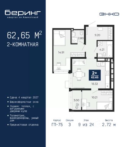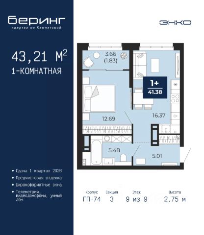 Торопитесь оформить бронирование по этой цене, предложение ограничено! Стоимость квартиры указана со скидкой, ваша экономия составит 280,685 руб. Звоните, наши менеджеры вам все расскажут. Просторная 1-комн. квартира с предчистовой отделкой в ЖК "Беринг" на 9 этаже. Общая площадь: 38.26 кв.м., жилая: 12.95 кв.м., площадь просторной кухни-столовой: 15.48 кв.м. Все окна выходят на одну сторону. В квартире одна лоджия, один совмещенный санузел. Высота потолков 2.75 м. Дом монолитный, многоподъездный, переменной этажности, от 9 до 22 этажей. Квартира находится в 73.4-й секции высотой 12 этажей в корпусе ГП-73. На этаже 8 квартир. В подъезде 1 пассажирский и 1 грузовой лифт. Окончание строительства - 1 квартал 2026 года. Оформление сделки по договору долевого участия. Подобно знаменитому исследователю, мы чувствуем себя первооткрывателями этой локации. Хотим показать новую суть места, сформировать для вас жизненный опыт, которого ещё не было. Беринг — район зелёного цвета. Беринг — район, который откроется вам с другой стороны. Впечатлит новым уровнем комфорта и качеством жизни. Беринг — открытие на карте города. Первый квартал расположен в районе Тура, в границах улиц: Камчатская Западносибирская Энтузиастов. Вокруг уже есть всё для того, чтобы ежедневная рутина была лишь частью жизни и не доставляла дискомфорта. Школы и детские сады, магазины и аптеки, поликлиника, места для семейного отдыха, пеших и велопрогулок, и даже рыбалки. Масштабное озеленение дворов — визитная карточка ЭНКО и ваш оазис спокойствия, чтобы отвлечься от повседневности. Раскидистые деревья, кустарники, травы и цветы — осталось остановиться, вдохнуть и расслабиться, глядя на эту природную красоту. Стилистика подъездов продолжает концепцию Беринга, вдохновлённого Камчаткой: сдержанный, но при этом впечатляющий дизайн соседствует с удобством и функциональностью. #z6ddgd