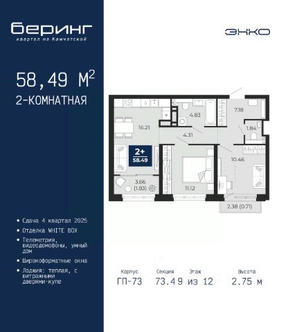 Двухкомнатная квартира с предчистовой отделкой в ЖК "Беринг" на 9 этаже. Общая площадь: 53.72 кв.м., жилая: 20.97 кв.м., площадь просторной кухни-столовой: 15.95 кв.м. Комнаты изолированные, все окна выходят на одну сторону. В квартире один балкон, один совмещенный санузел. Высота потолков 2.72 м. Дом монолитный, многоподъездный, переменной этажности, от 17 до 24 этажей. Квартира находится в 1-й секции высотой 23 этажа в корпусе ГП-75. На этаже 8 квартир. В подъезде 2 пассажирских и 1 грузовой лифт. Окончание строительства - 4 квартал 2027 года. Оформление сделки по договору долевого участия. Подобно знаменитому исследователю, мы чувствуем себя первооткрывателями этой локации. Хотим показать новую суть места, сформировать для вас жизненный опыт, которого ещё не было. Беринг — район зелёного цвета. Беринг — район, который откроется вам с другой стороны. Впечатлит новым уровнем комфорта и качеством жизни. Беринг — открытие на карте города. Первый квартал расположен в районе Тура, в границах улиц: Камчатская Западносибирская Энтузиастов. Вокруг уже есть всё для того, чтобы ежедневная рутина была лишь частью жизни и не доставляла дискомфорта. Школы и детские сады, магазины и аптеки, поликлиника, места для семейного отдыха, пеших и велопрогулок, и даже рыбалки. Масштабное озеленение дворов — визитная карточка ЭНКО и ваш оазис спокойствия, чтобы отвлечься от повседневности. Раскидистые деревья, кустарники, травы и цветы — осталось остановиться, вдохнуть и расслабиться, глядя на эту природную красоту. Стилистика подъездов продолжает концепцию Беринга, вдохновлённого Камчаткой: сдержанный, но при этом впечатляющий дизайн соседствует с удобством и функциональностью. #2m9gtF