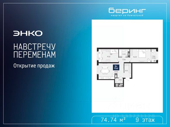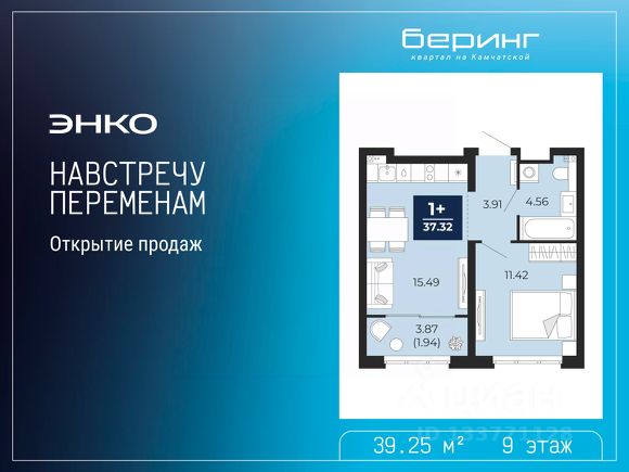 Спешите забронировать, пока действует скидка, срок предложения ограничен! Стоимость квартиры указана со скидкой, ваша экономия составит 561,371 руб. По всем вопросам звоните в офис продаж, мы вам все подробно расскажем. Продается 1-комн. квартира с предчистовой отделкой в ЖК "Беринг" на 9 этаже. Общая площадь: 38.26 кв.м., жилая: 12.95 кв.м., площадь просторной кухни-столовой: 15.48 кв.м. Все окна выходят на одну сторону. В квартире одна лоджия, один совмещенный санузел. Высота потолков 2.75 м. Дом монолитный, многоподъездный, переменной этажности, от 6 до 22 этажей. Квартира находится в 4-й секции высотой 12 этажей в корпусе ГП-73. На этаже 8 квартир. В подъезде 1 пассажирский и 1 грузовой лифт. Строительство завершено, дом сдан в 1 квартале 2026 года. Оформление сделки по договору купли-продажи. Подобно знаменитому исследователю, мы чувствуем себя первооткрывателями этой локации. Хотим показать новую суть места, сформировать для вас жизненный опыт, которого ещё не было. Беринг — район зелёного цвета. Беринг — район, который откроется вам с другой стороны. Впечатлит новым уровнем комфорта и качеством жизни. Беринг — открытие на карте города. Первый квартал расположен в районе Тура, в границах улиц: Камчатская Западносибирская Энтузиастов. Вокруг уже есть всё для того, чтобы ежедневная рутина была лишь частью жизни и не доставляла дискомфорта. Школы и детские сады, магазины и аптеки, поликлиника, места для семейного отдыха, пеших и велопрогулок, и даже рыбалки. Масштабное озеленение дворов — визитная карточка ЭНКО и ваш оазис спокойствия, чтобы отвлечься от повседневности. Раскидистые деревья, кустарники, травы и цветы — осталось остановиться, вдохнуть и расслабиться, глядя на эту природную красоту. Стилистика подъездов продолжает концепцию Беринга, вдохновлённого Камчаткой: сдержанный, но при этом впечатляющий дизайн соседствует с удобством и функциональностью.