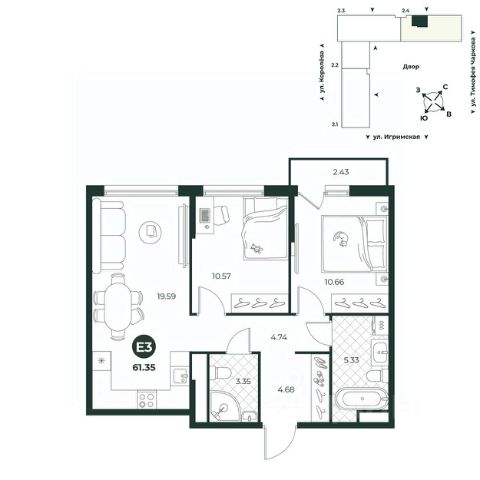 Классическая двухкомнатная квартира с мастер-спальней, оборудованной гардеробной и выходом на лоджию. Санузел совмещенный, что позволяет сэкономить средства на ремонте. Окна выходят на две стороны.