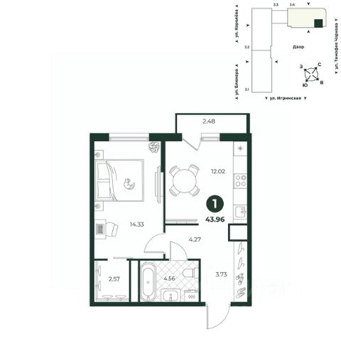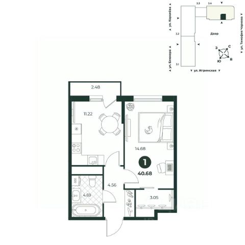 Евродвухкомнатная квартира с просторной кухней-гостиной, обеспечивающей комфортную организацию пространства для приготовления пищи и отдыха. Из комнаты можно выйти на балкон с видом во двор. Санузл совмещенный. В прихожей есть ниша под шкаф.