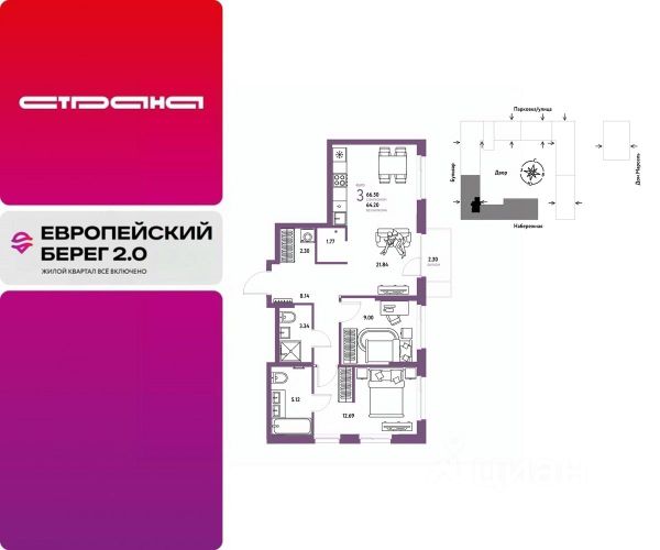 2-комн. квартира от застройщика с предчистовой отделкой в ЖК "Зарека" на 9 этаже. Общая площадь: 73.58 кв.м., жилая: 27 кв.м., площадь просторной кухни-гостиной: 24 кв.м. Квартира угловая, очень светлая, естественная вентиляция при открытии окон. В квартире один балкон, два совмещенных санузла. Высота потолков 2.7 м. Дом монолитный, многоподъездный, переменной этажности, от 6 до 16 этажей. Квартира находится в 1-й секции высотой 16 этажей в корпусе 5-2. На этаже 8 квартир. В подъезде 1 пассажирский и 1 грузовой лифт. Окончание строительства - 4 квартал 2026 года. Оформление сделки по договору долевого участия. Квартира с кухней-гостиной и двумя спальнями в жилом районе "Зарека". Особенности планировки: балкон, гардеробная, мастер-спальня, предчистовая отделка, разнесённые спальни. квартиры в нашей базе: ЗРК05.2-Ж1.9.2. Проект На планировочную структуру "Зареки" повлияла близость к автомобильному мосту Челюскинцев. Мы расположили жилые здания так, чтобы они постепенно удалялись от проезжей части. Приём напоминает лесенку: чем сильнее мост возвышается над участком застройки, тем дальше по отношению к нему стоят дома. Этот ступенчатый сдвиг позволил нам сформировать буфер между кварталами и оживлённой магистралью. Мы намерены высадить здесь высокие деревья и создать дополнительную защиту от дорожных шума и пыли. В границах нашего участка мы намерены разместить школу и два встроенных детских сада на 135 и 150 мест. Общественные пространства С севера на юг территорию будет пронизывать пешеходный бульвар. Мы мыслим это общественное пространство как главный центр притяжения. На нём будут сосредоточены основные детские игровые и спортивные зоны, места для встреч и спокойного отдыха. Он также сыграет роль мостика, ведущего к другим нашим проектам — "Европейскому кварталу" и "Дому у озера". Одна из базовых идей мастер-плана касается береговой линии. Сегодня озеленение этой территории носит стихииныи характер, а прямому доступу к Туре препятствует дамба. Мы хотим благоустроить пространства у воды и открыть их для людей. Архитекторы спроектировали систему многоярусных троп и спусков к реке, смотровые площадки и места для активного отдыха и пикников. #zSlo32