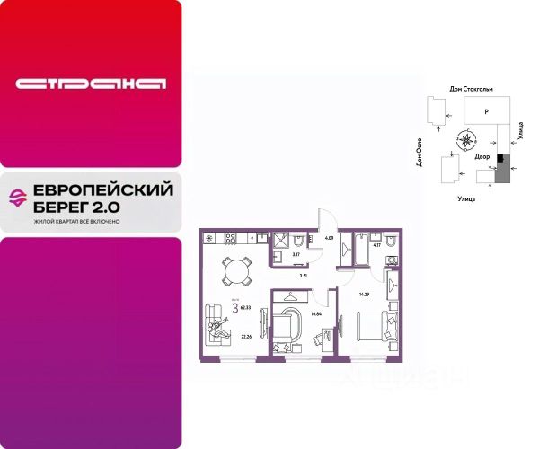 Трехкомнатная квартира от застройщика с предчистовой отделкой в ЖК "Зарека" на 9 этаже. Общая площадь: 117.05 кв.м. Высота потолков 2.7 м. Дом монолитный, многоподъездный, переменной этажности, от 6 до 16 этажей. Квартира находится во 2-й секции высотой 9 этажей в корпусе 5-2. На этаже 3 квартиры. В подъезде 1 пассажирский и 1 грузовой лифт. Окончание строительства - 4 квартал 2026 года. Оформление сделки по договору долевого участия. Квартира с кухней-гостиной и тремя спальнями в жилом районе "Зарека". Особенности планировки: балкон, мастер-спальня, постирочная, предчистовая отделка, разнесённые спальни. квартиры в нашей базе: ЗРК05.2-Ж2.9.1. Проект На планировочную структуру "Зареки" повлияла близость к автомобильному мосту Челюскинцев. Мы расположили жилые здания так, чтобы они постепенно удалялись от проезжей части. Приём напоминает лесенку: чем сильнее мост возвышается над участком застройки, тем дальше по отношению к нему стоят дома. Этот ступенчатый сдвиг позволил нам сформировать буфер между кварталами и оживлённой магистралью. Мы намерены высадить здесь высокие деревья и создать дополнительную защиту от дорожных шума и пыли. В границах нашего участка мы намерены разместить школу и два встроенных детских сада на 135 и 150 мест. Общественные пространства С севера на юг территорию будет пронизывать пешеходный бульвар. Мы мыслим это общественное пространство как главный центр притяжения. На нём будут сосредоточены основные детские игровые и спортивные зоны, места для встреч и спокойного отдыха. Он также сыграет роль мостика, ведущего к другим нашим проектам — "Европейскому кварталу" и "Дому у озера". Одна из базовых идей мастер-плана касается береговой линии. Сегодня озеленение этой территории носит стихииныи характер, а прямому доступу к Туре препятствует дамба. Мы хотим благоустроить пространства у воды и открыть их для людей. Архитекторы спроектировали систему многоярусных троп и спусков к реке, смотровые площадки и места для активного отдыха и пикников.