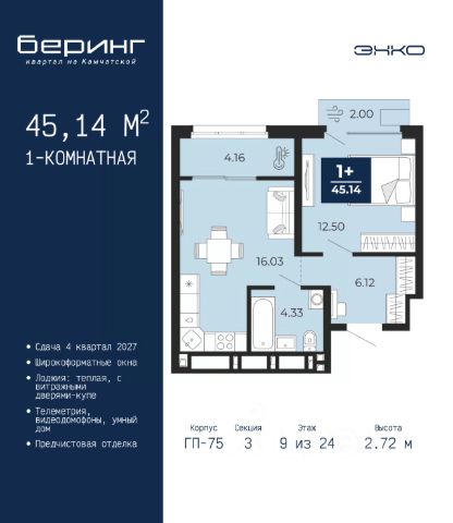 Спешите оформить бронирование на этих условиях, срок предложения ограничен! Стоимость квартиры указана со скидкой, ваша экономия составит 561,371 руб. По всем вопросам звоните в офис продаж, наши менеджеры вам все расскажут. Продается 1-комн. квартира с предчистовой отделкой в ЖК "Беринг" на 9 этаже. Общая площадь: 38.26 кв.м., жилая: 12.95 кв.м., площадь просторной кухни-столовой: 15.48 кв.м. Все окна выходят на одну сторону. В квартире одна лоджия, один совмещенный санузел. Высота потолков 2.75 м. Дом монолитный, многоподъездный, переменной этажности, от 9 до 22 этажей. Квартира находится в 4-й секции высотой 12 этажей в корпусе ГП-73. На этаже 8 квартир. В подъезде 1 пассажирский и 1 грузовой лифт. Окончание строительства - 1 квартал 2026 года. Оформление сделки по договору долевого участия. Подобно знаменитому исследователю, мы чувствуем себя первооткрывателями этой локации. Хотим показать новую суть места, сформировать для вас жизненный опыт, которого ещё не было. Беринг — район зелёного цвета. Беринг — район, который откроется вам с другой стороны. Впечатлит новым уровнем комфорта и качеством жизни. Беринг — открытие на карте города. Первый квартал расположен в районе Тура, в границах улиц: Камчатская Западносибирская Энтузиастов. Вокруг уже есть всё для того, чтобы ежедневная рутина была лишь частью жизни и не доставляла дискомфорта. Школы и детские сады, магазины и аптеки, поликлиника, места для семейного отдыха, пеших и велопрогулок, и даже рыбалки. Масштабное озеленение дворов — визитная карточка ЭНКО и ваш оазис спокойствия, чтобы отвлечься от повседневности. Раскидистые деревья, кустарники, травы и цветы — осталось остановиться, вдохнуть и расслабиться, глядя на эту природную красоту. Стилистика подъездов продолжает концепцию Беринга, вдохновлённого Камчаткой: сдержанный, но при этом впечатляющий дизайн соседствует с удобством и функциональностью. #ZMDdgd