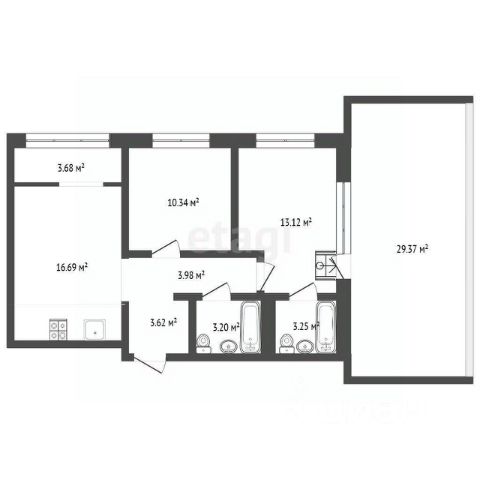 - Общая площадь с учетом утепленного балкона 71м2., кухня-гостиная 20 кв.м., детская комната, родительская спальня, два санузла