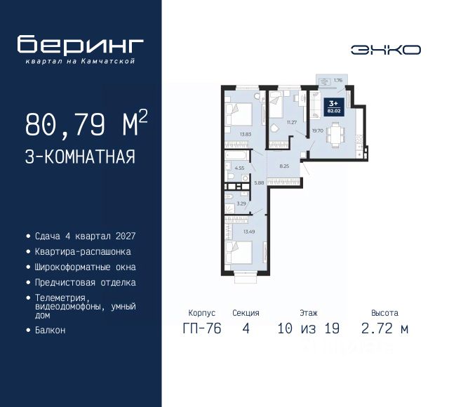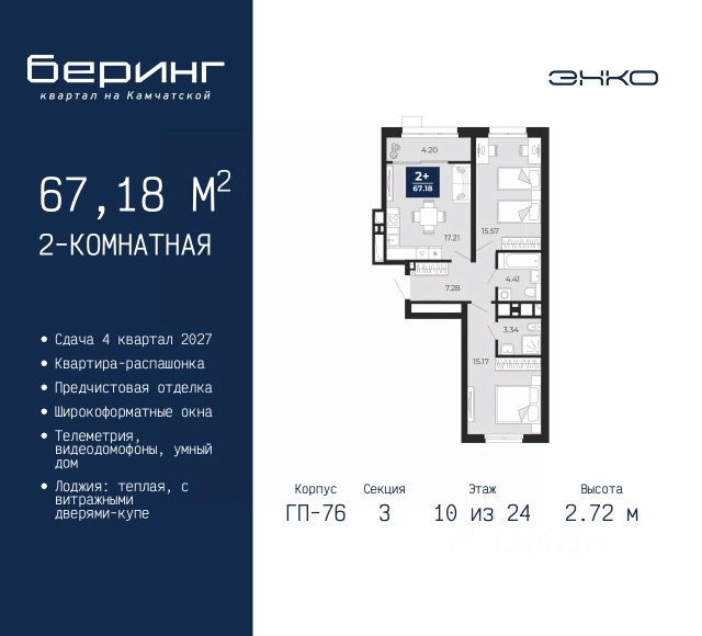 2-комн. квартира с предчистовой отделкой в ЖК "Беринг" на 10 этаже. Общая площадь: 50.42 кв.м., жилая: 22.6 кв.м., площадь просторной кухни-столовой: 15.11 кв.м. Комнаты изолированные, все окна выходят на одну сторону. В квартире один балкон, один совмещенный санузел. Высота потолков 2.72 м. Дом монолитный, черырехподъездный, переменной этажности, от 19 до 24 этажей. Квартира находится во 2-й секции высотой 19 этажей в корпусе ГП-76. На этаже 8 квартир. В подъезде 1 пассажирский и 1 грузовой лифт. Окончание строительства - 4 квартал 2027 года. Оформление сделки по договору долевого участия. Подобно знаменитому исследователю, мы чувствуем себя первооткрывателями этой локации. Хотим показать новую суть места, сформировать для вас жизненный опыт, которого ещё не было. Беринг — район зелёного цвета. Беринг — район, который откроется вам с другой стороны. Впечатлит новым уровнем комфорта и качеством жизни. Беринг — открытие на карте города. Первый квартал расположен в районе Тура, в границах улиц: Камчатская Западносибирская Энтузиастов. Вокруг уже есть всё для того, чтобы ежедневная рутина была лишь частью жизни и не доставляла дискомфорта. Школы и детские сады, магазины и аптеки, поликлиника, места для семейного отдыха, пеших и велопрогулок, и даже рыбалки. Масштабное озеленение дворов — визитная карточка ЭНКО и ваш оазис спокойствия, чтобы отвлечься от повседневности. Раскидистые деревья, кустарники, травы и цветы — осталось остановиться, вдохнуть и расслабиться, глядя на эту природную красоту. Стилистика подъездов продолжает концепцию Беринга, вдохновлённого Камчаткой: сдержанный, но при этом впечатляющий дизайн соседствует с удобством и функциональностью. #2mMc6V Купить квартиру в ипотеку в микрорайоне Энтузиастов в городе Тюмень.