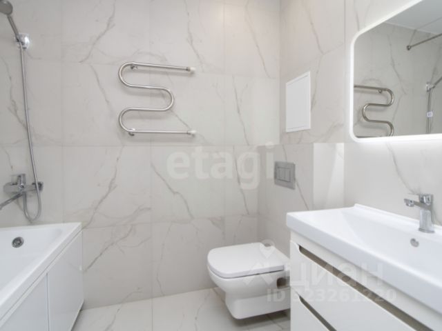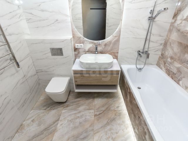 Ванная комната оснащена электрическим теплым полом, подвесной тумбой с накладной раковиной, ванной с душевой системой.