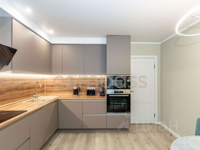 на кухне: кухонный гарнитур со встроенной варочной поверхностью, встроенной стиральной машиной, стол со стульями, духовой шкаф, микроволновая печь, холодильник.