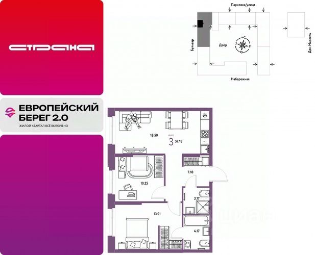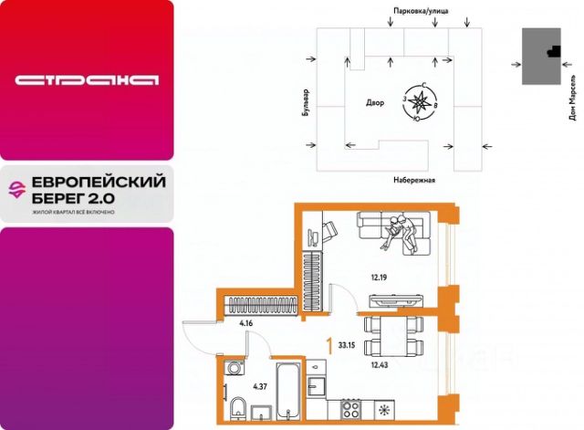 Объявление от застройщика Страна Девелопмент. Покупка квартиры защищена банком. Продается 2комнатная квартира на 5 этаже от застройщика Страна Девелопмент. Площадь квартиры 34,21 кв. м. Стоимость указана без учета акций. Европейский берег 2.0. — это продолжение легендарного жилого комплекса Европейский берег. Он включает все, что нужно для жизни, и даже больше. Этот квартал для тех, кто не готов тратить время на ненужное, жертвовать одним ради другого. Для тех, кто хочет получить все и сразу. Именно поэтому генеральная идея проекта — жилой квартал все включено. Все преимущества включены. Никаких исключений. ПРЕИМУЩЕСТВА Разнообразие планировок: от классических до квартир с мастер-спальней и террасами. Подземный паркинг с кладовыми, охраной и видеонаблюдением 24/7. Ремонт от застройщика: 5 вариантов на выбор. Закрытый двор с площадками и зонами отдыха: мост-акведук, тренажёры, лабиринты, гамаки и шезлонги. ОТДЕЛКА Базовая отделка или готовый ремонт от застройщика. В базовой отделке все черновые работы выполнены, подведены коммуникации, стены оштукатурены под маяк. В ремонт от застройщика входит 5 вариантов отделки, уже включено всё необходимое: от сантехники до кондиционера. СПОСОБЫ ПОКУПКИ Сотрудники "Страны Девелопмент" будут сопровождать вас на каждом этапе сделки, помогут получить одобрение по ипотеке или снизить ежемесячный платеж. - ипотека - материнский капитал - 100% оплата наличными - рассрочка - обмен — это выкуп вашей старой квартиры и зачисление полученных денежных средств в счет стоимости новой квартиры или в качестве первоначального взноса по ипотеке.
