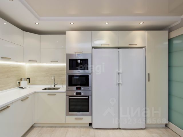 Кухня оборудована встроенной мебелью и техникой премиальных брендов Bosch и Gorenje: варочная панель, духовой шкаф, микроволновка, кофемашина, посудомоечная машина (60 см) и вместительный холодильник всё остаётся новым владельцам.
