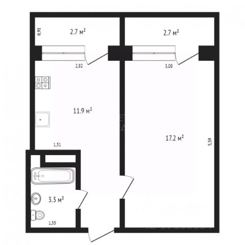 В санузле акриловая ванна, тумба раковина, зеркало, есть выводы для стиральной машины.