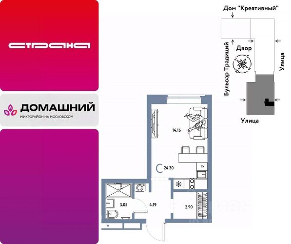Объявление от застройщика Страна Девелопмент. Покупка квартиры защищена банком. Продается 1комнатная квартира на 4 этаже от застройщика Страна Девелопмент. Площадь квартиры 27,75 кв. м. О ПРOЕКТЕ Mикpорайон "Домaшний" — этo 6 очередей стpоитeльcтвa, 24 дома пеpемeннoй этажнoсти. Каждый дом уникальный. Внутри микрорайона появится огромный пешеходный бульвар — бульвар Традиций. Центром притяжения станут открытые пространства для отдыха жителей и гостей микрорайона, которые легко меняются под сезонные сценарии отдыха: новогодняя елка, ярмарки, кинопоказы и т.д. У каждого дома обустроен приватный двор с зонами для активного и спокойного отдыха. В активной зоне детские разновозрастные площадки с горками, песочницами и качелями, воркаут-зоны. В спокойной — скамейки, мини-амфитеатры, закрытые перголы. Уютной атмосферу сделает обильное озеленение и освещение "домашними" торшерами. ОТДЕЛКА Квартиры сдаются с предчистовой отделкой. Все грязные работы выполнены: произведена разводка электричества и отопления; выполнена стяжка пола; стены выровнены "под маяк". В квартире установлены розетки, выключатели и радиаторы. На входе — надежная стальная дверь. Вам остается только выбрать материалы и начать ремонт Доступна опция "Ремонт от застройщика". Стоимость можно включить в ипотеку. КУХНЯ С ТЕХНИКОЙ Теперь дополнительно к ремонту можно заказать кухню со встроенной техникой. Эргономику и функциональное наполнение разработали под каждую планировку. ПОЛНАЯ МЕБЛИРОВКА Больше не нужно тратить время даже на подбор, доставку и сборку мебели.Вы можете включить в стоимость квартиры с ремонтом полную меблировку. Что входит в меблировку? - Кухня с техникой и сантехникой - Диван - Кровать - Шкаф в спальне - Шкаф в прихожей