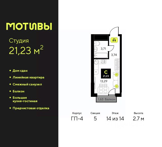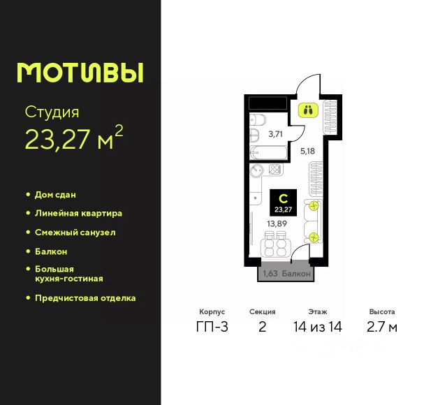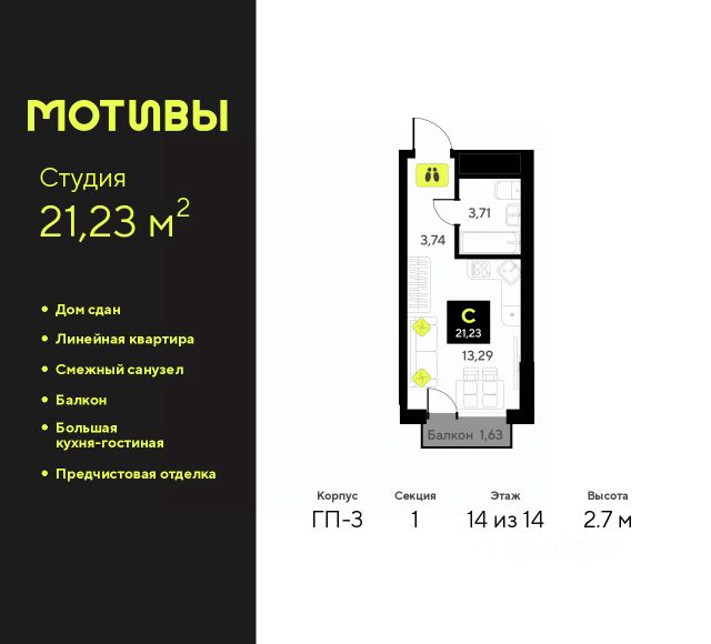 Однокомнатная квартира-студия от застройщика с предчистовой отделкой в ЖК "Мотивы" на 13 этаже. Общая площадь: 24.95 кв.м., площадь гостиной 14.02 кв.м., из которых 5 кв.м. выделено под кухонную зону. Все окна выходят на одну сторону. В квартире один балкон, один совмещенный санузел. Высота потолков 2.7 м. Квартира будет сдаваться с предчистовой отделкой White Box: выровнены и оштукатурены стены, проведено электричество и отопление, установлены радиаторы. Вы также можете приобрести квартиру с ремонтом от застройщика, представленным в трех цветовых решениях Scandi, Wood и Coffee и включающим ламинат, обои под покраску, двери, натяжной потолок и санузел с сантехникой. При желании вы можете заказать отделку под ключ, варианты возможных решений представлены в альбоме фотографий. Дом монолитный, черырехподъездный, переменной этажности, от 12 до 14 этажей. Квартира находится во 2-й секции высотой 14 этажей в корпусе ГП-6. На этаже 12 квартир. В подъезде 1 пассажирский и 1 грузовой лифт. Окончание строительства - 2 квартал 2026 года. Оформление сделки по договору долевого участия. Закрытая от автомобилей территория, безопасный двор и камеры видеонаблюдения - гаранты вашего спокойствия. Квартал будет располагать богатой инфраструктурой: на первых этажах разместятся магазины, пекарни, кофейни, пункты выдачи, аптеки, детские центры, цветочные салоны и многое другое, что сделает жизнь поистине комфортной. Рядом находится парк общей площадью почти 5000 м², в котором располагаются локации для игр и отдыха жителей, здесь можно совершить утреннюю пробежку или прогуляться после рабочего дня. В парке есть зона воркаута с тренажерами для взрослых, игровые комплексы с горками и канатный комплекс для детей разных возрастов, качели и лавочки для отдыха, площадки для командных видов спорта и для панна-футбола. В ЖК "Мотивы" всё продумано до мелочей: светлые холлы входных групп, оформленные в едином стиле, просторные колясочные, лапомойки для питомцев. На территории комплекса находятся 2 8-ми этажных паркинга и более 1000 м/м на открытой парковке. Жилой комплекс находится в одном из экологически благоприятных районов Тюмени, недалеко от Плехановского бора. При этом до центра города можно добраться за 15 минут, а до международного аэропорта Рощино за 13 минут. Окончание строительства: ГП 1, 2, 3, 4 сдача до конца 2024 года, ГП 6, 7, 8 сдача 2 квартал 2026 года. #2wA7bi
