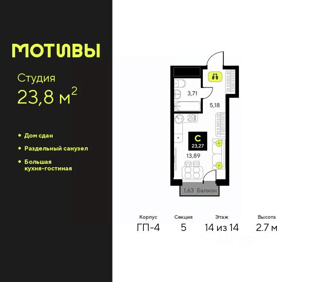 Однокомнатная квартира-студия в ЖК "Мотивы" на 14 этаже. Общая площадь: 21.7 кв.м. Высота потолков 2.7 м. Дом монолитный, черырехподъездный, переменной этажности, от 12 до 14 этажей. Квартира находится во 2-й секции высотой 14 этажей в корпусе ГП-3. На этаже 12 квартир. В подъезде 1 пассажирский и 1 грузовой лифт. В настоящее время строительство окончено, дом сдан в 4 квартале 2024 года. Оформление сделки по договору купли-продажи. Закрытая от автомобилей территория, безопасный двор и камеры видеонаблюдения - гаранты вашего спокойствия. Квартал будет располагать богатой инфраструктурой: на первых этажах разместятся магазины, пекарни, кофейни, пункты выдачи, аптеки, детские центры, цветочные салоны и многое другое, что сделает жизнь поистине комфортной. Рядом находится парк общей площадью почти 5000 м², в котором располагаются локации для игр и отдыха жителей, здесь можно совершить утреннюю пробежку или прогуляться после рабочего дня. В парке есть зона воркаута с тренажерами для взрослых, игровые комплексы с горками и канатный комплекс для детей разных возрастов, качели и лавочки для отдыха, площадки для командных видов спорта и для панна-футбола. В ЖК "Мотивы" всё продумано до мелочей: светлые холлы входных групп, оформленные в едином стиле, просторные колясочные, лапомойки для питомцев. На территории комплекса находятся 2 8-ми этажных паркинга и более 1000 м/м на открытой парковке. Жилой комплекс находится в одном из экологически благоприятных районов Тюмени, недалеко от Плехановского бора. При этом до центра города можно добраться за 15 минут, а до международного аэропорта Рощино за 13 минут. Окончание строительства: ГП 1, 2, 3, 4 сдача до конца 2024 года, ГП 6, 7, 8 сдача 2 квартал 2026 года. #ZMfW5v