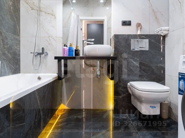 В санузле использована крупноформатная плитка, что придаёт интерьеру современный и элегантный внешний вид, а также визуально увеличивает пространство. Установлена душевая кабинка, подвесная тумба с раковиной, новая сантехника, зеркало с подсветкой и инсталляция.