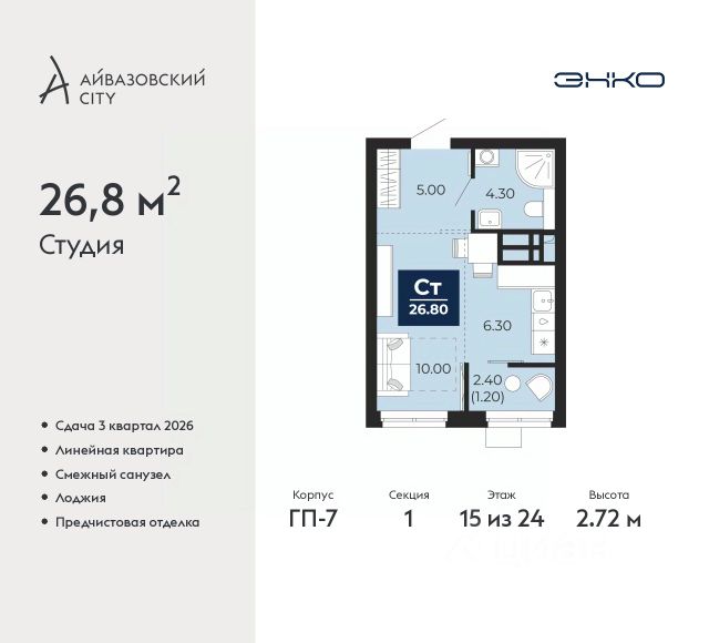 1-комн. квартира-студия от застройщика с предчистовой отделкой в ЖК "Окинава" на 11 этаже. Общая площадь: 28.8 кв.м., площадь гостиной 19.91 кв.м., из которых 5 кв.м. выделено под кухонную зону. Все окна выходят на одну сторону. В квартире одна лоджия, один совмещенный санузел. Высота потолков 2.7 м. Квартира будет сдана с предчистовой отделкой: на полах стяжка под финишное покрытие, стены подготовлены под покраску или оклейку обоями, разведена вся электрика с подготовкой для установки выключателей и освещения. При желании вы можете заказать отделку под ключ, варианты возможных решений представлены в альбоме фотографий. Дом монолитный, многоподъездный, переменной этажности, от 11 до 19 этажей. Квартира находится в 3-й секции высотой 13 этажей в корпусе Дом Воды. На этаже 6 квартир. В подъезде 1 пассажирский и 1 грузовой лифт. Окончание строительства - 4 квартал 2026 года. Оформление сделки по договору долевого участия. ЖК "Окинава" это не просто жилой комплекс, это остров 4 стихий. Они отражаются во внешнем виде фасадов домов, обустройстве дворов и внутреннем оформлении холлов. Каждая из стихий это отдельный дом. Между домами раскинется большой двухуровневый пешеходный бульвар. Первый уровень прогулочный с местами для отдыха, амфитеатром и фонтанами. На втором уровне расположатся площадки для детей, спортивных игр и тренировок. Квартал будет располагать богатой инфраструктурой: на первых этажах разместятся магазины, пекарни, кофейни, пункты выдачи, аптеки, детские центры, цветочные салоны и многое другое, что сделает жизнь поистине комфортной. В жилом комплексе есть кладовые, а также несколько видов паркинга: уличный гостевой, закрытый теплый и паркинг в стилобате, попасть в который можно на лифте с любого жилого этажа. Дворы в каждом доме отражают его стихию, отличаясь по наполнению. Они дополняют друг друга, образуя единое дворовое пространство жилого комплекса. Закрытая территория, свободная от автомобилей, обеспечит безопасность и спокойный отдых. Холлы оформлены керамогранитом, зеркалами и разноуровневым освещением. Витражные входные группы, мягкие зоны ожидания, видеонаблюдение 24/7, вместительные колясочные и даже лапомойки для питомцев всё это будет в ЖК "Окинава". Жилой комплекс "Окинава" находится в активно развивающемся V заречном микрорайоне, недалеко от озера Алебашево, где в будущем расположится масштабный ивент-парк с зонами отдыха. Удобная транспортная развязка позволит добраться до центра всего за 15 минут. #Z4a87i