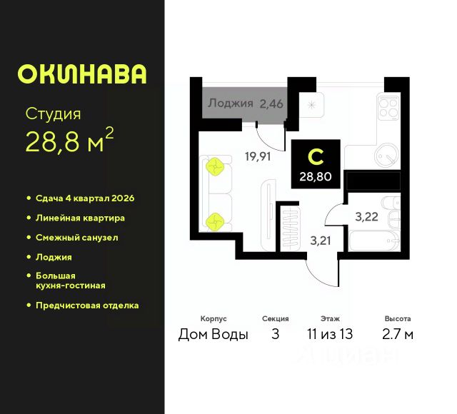 Просторная 1-комн. квартира-студия с предчистовой отделкой в ЖК "Айвазовский City" на 5 этаже. Общая площадь: 28 кв.м., площадь гостиной 17.1 кв.м., из которых 6.7 кв.м. выделено под кухонную зону. Все окна выходят на одну сторону. В квартире одна лоджия, один совмещенный санузел. Высота потолков 2.72 м. Дом монолитный, многоподъездный, переменной этажности, от 9 до 24 этажей. Квартира находится во 2-й секции высотой 24 этажа в корпусе ГП-7. На этаже 7 квартир. В подъезде 1 пассажирский и 2 грузовых лифта. Окончание строительства - 3 квартал 2026 года. Оформление сделки по договору долевого участия. Новый жилой район располагается в живописном месте на берегу Туры в центральной части города. Принципиально новое пространство для жизни в центре современного города для тех, чьи мечты сбываются, кто нацелен на постоянный рост, перемены к лучшему для себя и своих близких. Каждая деталь Айвазовский City вдохновляет и заряжает на новые свершения: авторская архитектура, сбалансированная продуманная инфраструктура, дизайнерские дворы со спортивными и детскими площадками, парковые зоны с фонтанами, водный канал, украшающий центральный прогулочный маршрут района и многое другое. В 2019 года проект стал лауреатом престижной премии Urban Awards 2019 в номинации "Лучший строящийся региональный жилой комплекс бизнес-класса". Главная особенность Айвазовский City - соседство разных архитектурных школ в рамках одного дома. Изысканная классика, выразительная эклектика и оригинальный модерн - жить в одном из таких домов настоящий повод для гордости. Айвазовский City это идеальное сочетание комфорта, технологий и развитой инфраструктуры. Вход в подъезд возможен с улицы и со двора. Отправляясь на работу или за покупками, жители могут выйти с внешней стороны дома, а для прогулки с ребенком со стороны двора. Экологически чистые материалы и энергосберегающие технологии, качественное освещение общественных зон, видеонаблюдение по всей территории жилого района (в том числе в подъездах, лифтах и в подземном паркинге), закрытые дворы с доступом только для жителей Айвазовский City. Часть домов в Айвазовский City будут оснащены подземным паркингом. Востребованный в нашем климатическом поясе формат хранения автомобилей защитит собственность владельца в любое время года. Аккредитация в банках: "Сбербанк России", ОАО "Альфа-Банк", ПАО "Газпромбанк", ПАО Банк "ВТБ", ПАО "Совкомбанк" и других. #zSfmM9