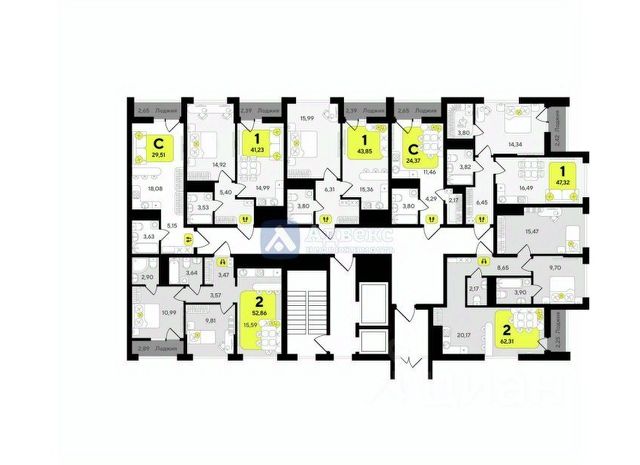 В домах микрорайона "Горизонт" представлены студии и квартиры с количеством комнат от одной до трех площадью от 23,90 кв. м до 81,37 кв. м с потолками высотой 270 см.