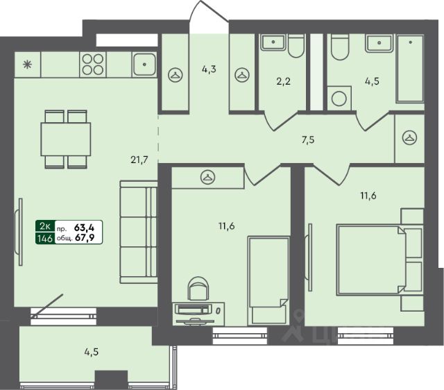 Продаётся квартира площадью 58.22 м2 в жилом комплексе "Смородина". Квартира находится на 3 этаже, жилая площадь квартиры 24.87 м2, площадь просторной кухни — 18.39 м2. Среди особенностей планировки — изолированные комнаты с окнами на одну сторону, 1 совмещённый санузел. Срок сдачи — IV кв. 2026 Жилой комплекс "Смородина" — это: - уютный малоэтажный комплекс в районе ММС - дома высотой 4 этажа - квартиры от студий до семейных вариантов с отапливаемыми лоджиями - экологичные материалы в благоустройстве территории Окружение В 5 минутах ходьбы от проекта — озеро Липовое с песчаным пляжем и лесопарковая зона. Инфраструктура В шаговой доступности есть все для комфортной жизни: школы, детские сады, магазины и аптеки. Рядом с проектом — остановка общественного транспорта. Благоустройство Прямо во дворе — собственные грядки для жителей, где можно выращивать зелень и цветы. Для детей оборудованы детские площадки из натуральных материалов. Лобби Вдохновленные современными тенденциями наши парадные разработаны с акцентом на эстетическую привлекательность и практичность. Использование натуральных материалов и ярких цветовых акцентов создает атмосферу уюта и стиля. Планировки Среди многообразия продуманных планировок есть и уютные студии, и просторные семейные варианты. Во всех квартирах предусмотрены отапливаемые лоджии, где можно устроить зону отдыха или рабочий кабинет.