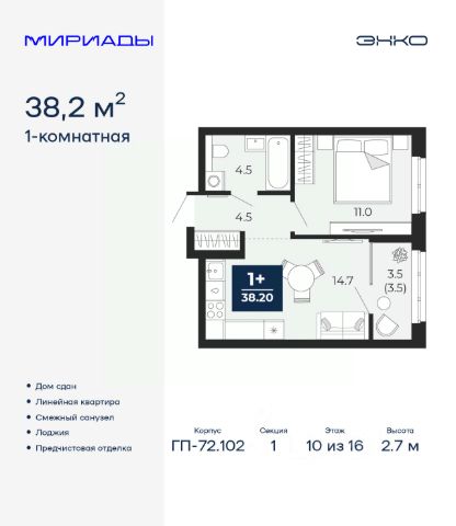 Однокомнатная квартира от застройщика с предчистовой отделкой в ЖК "Мириады" на 10 этаже. Общая площадь: 38.2 кв.м., жилая: 11 кв.м., площадь просторной кухни-столовой: 14.7 кв.м. Все окна выходят на одну сторону. В квартире одна лоджия, один совмещенный санузел. Высота потолков 2.7 м. Дом монолитный, многоподъездный, переменной этажности, от 14 до 16 этажей. Квартира находится в 1-й секции высотой 16 этажей в корпусе ГП-72.102. На этаже 9 квартир. В подъезде 1 пассажирский и 1 грузовой лифт. Строительство завершено, дом сдан в 4 квартале 2025 года. Оформление сделки по договору купли-продажи. Вселенная бесконечных историй. Ранее невиданный Тюмени масштаб: территория 240 гектаров и 1 650 000 м² застройки. Мириады это город масштабных перемен и больших возможностей. Город зеленых рощ и зеркальных озер. Город для работы, учебы и развлечений. Город для детей и их родителей. Город для всех и каждого. Проект расположен в районе Мыс рядом с ТРЦ "Тюмень Сити Молл" в границах улицы Тимофея Чаркова, Тобольского тракта и объездной дороги. Срок полного освоения территории - до 2034 года. #zmeveO