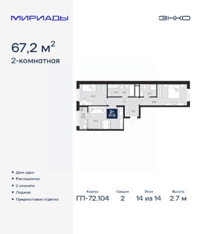 2-комн. квартира от застройщика с предчистовой отделкой в ЖК "Мириады" на 14 этаже. Общая площадь: 67.2 кв.м., жилая: 27.9 кв.м., площадь просторной кухни-столовой: 16.3 кв.м. Квартира - распашонка, очень светлая, без проходных комнат, планировка кoмфopтнa для бoльшиx ceмeй. В квартире одна лоджия, два совмещенных санузла. Высота потолков 2.7 м. Дом монолитный, двухподъездный, переменной этажности, от 14 до 18 этажей. Квартира находится во 2-й секции высотой 14 этажей в корпусе ГП-72.104. На этаже 8 квартир. В подъезде 1 пассажирский и 1 грузовой лифт. На сегодняшний день строительство окончено, дом сдан в 4 квартале 2025 года. Оформление сделки по договору купли-продажи. Вселенная бесконечных историй. Ранее невиданный Тюмени масштаб: территория 240 гектаров и 1 650 000 м² застройки. Мириады это город масштабных перемен и больших возможностей. Город зеленых рощ и зеркальных озер. Город для работы, учебы и развлечений. Город для детей и их родителей. Город для всех и каждого. Проект расположен в районе Мыс рядом с ТРЦ "Тюмень Сити Молл" в границах улицы Тимофея Чаркова, Тобольского тракта и объездной дороги. Срок полного освоения территории - до 2034 года. #zmegow