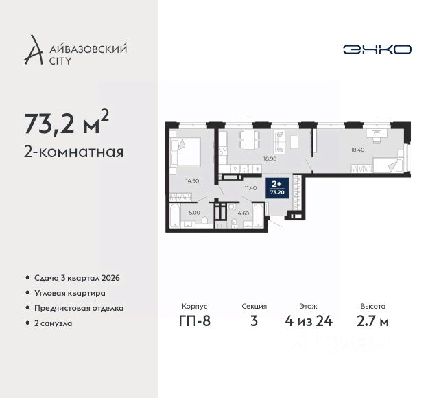 Двухкомнатная квартира в ЖК "Айвазовский City" на 5 этаже. Квартира без отделки, новый владелец может сделать ремонт по индивидуальному проекту. Общая площадь: 63.58 кв.м., жилая: 26.79 кв.м., площадь просторной кухни-столовой: 16.67 кв.м. Угловая квартира, очень светлая, естественная вентиляция при открытии окон. В квартире одна лоджия, два совмещенных санузла. Высота потолков 2.72 м.