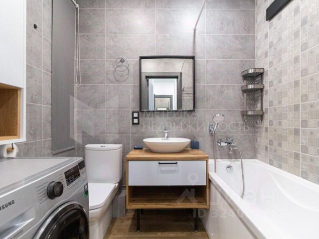 В ванной комнате тумба с раковиной, зеркало, инсталляция, ванна, стиральная машинка.