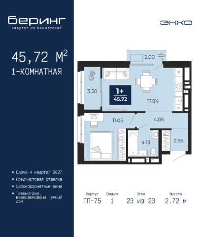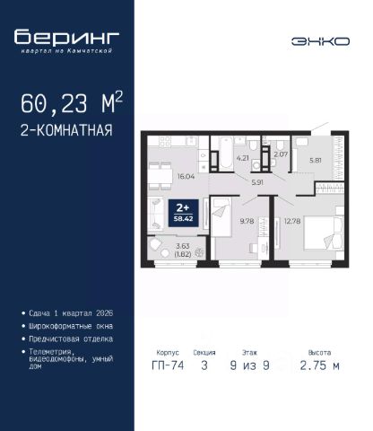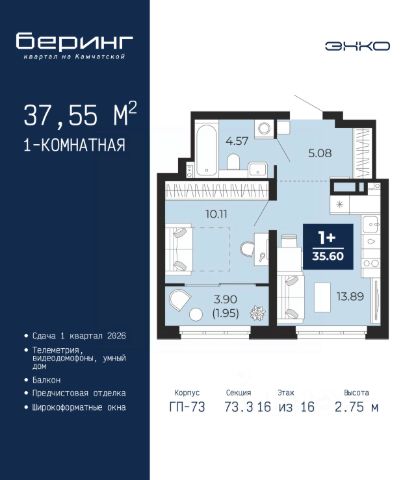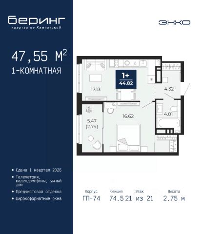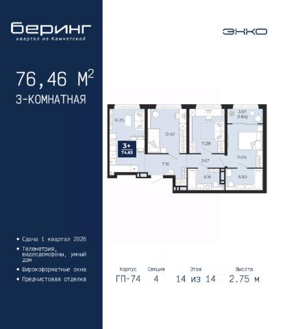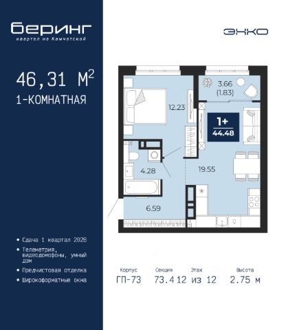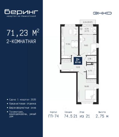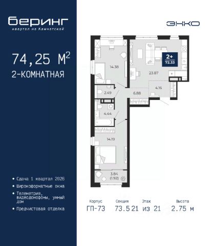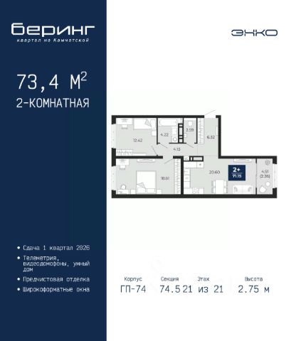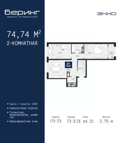 Успейте оформить бронирование по этой цене, срок акции ограничен! Стоимость квартиры указана со скидкой, ваша экономия составит 457,982 руб. По всем вопросам обращайтесь в офис продаж, мы вам все подробно расскажем. Двухкомнатная квартира от застройщика с предчистовой отделкой в ЖК "Беринг" на 21 этаже. Общая площадь: 74.25 кв.м. Высота потолков 2.75 м. Дом монолитный, многоподъездный, переменной этажности, от 9 до 22 этажей. Квартира находится в 73.5-й секции высотой 21 этаж в корпусе ГП-73. На этаже 6 квартир. В подъезде 1 пассажирский и 1 грузовой лифт. Окончание строительства - 1 квартал 2026 года. Оформление сделки по договору долевого участия. Подобно знаменитому исследователю, мы чувствуем себя первооткрывателями этой локации. Хотим показать новую суть места, сформировать для вас жизненный опыт, которого ещё не было. Беринг — район зелёного цвета. Беринг — район, который откроется вам с другой стороны. Впечатлит новым уровнем комфорта и качеством жизни. Беринг — открытие на карте города. Первый квартал расположен в районе Тура, в границах улиц: Камчатская Западносибирская Энтузиастов. Вокруг уже есть всё для того, чтобы ежедневная рутина была лишь частью жизни и не доставляла дискомфорта. Школы и детские сады, магазины и аптеки, поликлиника, места для семейного отдыха, пеших и велопрогулок, и даже рыбалки. Масштабное озеленение дворов — визитная карточка ЭНКО и ваш оазис спокойствия, чтобы отвлечься от повседневности. Раскидистые деревья, кустарники, травы и цветы — осталось остановиться, вдохнуть и расслабиться, глядя на эту природную красоту. Стилистика подъездов продолжает концепцию Беринга, вдохновлённого Камчаткой: сдержанный, но при этом впечатляющий дизайн соседствует с удобством и функциональностью. #2ME1o0