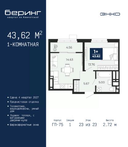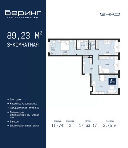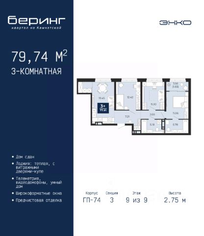 Спешите оформить бронирование на этих условиях, срок акции ограничен! Стоимость квартиры указана со скидкой, ваша экономия составит 844,145 руб. Звоните, наши менеджеры вам все расскажут. 2-комн. квартира от застройщика с предчистовой отделкой в ЖК "Беринг" на 12 этаже. Общая площадь: 61.99 кв.м., жилая: 21.58 кв.м., площадь просторной кухни-столовой: 16.21 кв.м. Комнаты изолированные, все окна выходят на одну сторону. В квартире один балкон и одна лоджия, один совмещенный и один раздельный санузел. Высота потолков 2.75 м. Дом монолитный, многоподъездный, переменной этажности, от 9 до 22 этажей. Квартира находится в 4-й секции высотой 12 этажей в корпусе ГП-73. На этаже 8 квартир. В подъезде 1 пассажирский и 1 грузовой лифт. На сегодняшний день строительство завершено, дом сдан в 1 квартале 2026 года. Оформление сделки по договору купли-продажи. Подобно знаменитому исследователю, мы чувствуем себя первооткрывателями этой локации. Хотим показать новую суть места, сформировать для вас жизненный опыт, которого ещё не было. Беринг — район зелёного цвета. Беринг — район, который откроется вам с другой стороны. Впечатлит новым уровнем комфорта и качеством жизни. Беринг — открытие на карте города. Первый квартал расположен в районе Тура, в границах улиц: Камчатская Западносибирская Энтузиастов. Вокруг уже есть всё для того, чтобы ежедневная рутина была лишь частью жизни и не доставляла дискомфорта. Школы и детские сады, магазины и аптеки, поликлиника, места для семейного отдыха, пеших и велопрогулок, и даже рыбалки. Масштабное озеленение дворов — визитная карточка ЭНКО и ваш оазис спокойствия, чтобы отвлечься от повседневности. Раскидистые деревья, кустарники, травы и цветы — осталось остановиться, вдохнуть и расслабиться, глядя на эту природную красоту. Стилистика подъездов продолжает концепцию Беринга, вдохновлённого Камчаткой: сдержанный, но при этом впечатляющий дизайн соседствует с удобством и функциональностью. #zmEOZI