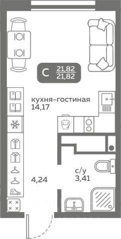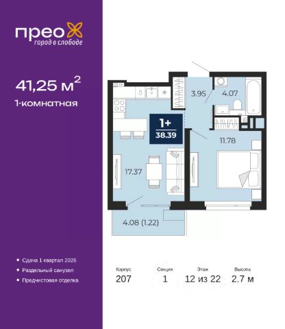 Однокомнатная квартира с предчистовой отделкой в ЖК "Прео" на 12 этаже. Общая площадь: 43.88 кв.м., жилая: 15.41 кв.м., площадь просторной кухни-столовой: 14.98 кв.м. Все окна выходят на одну сторону. В квартире одна лоджия, один совмещенный санузел. Высота потолков 2.7 м.