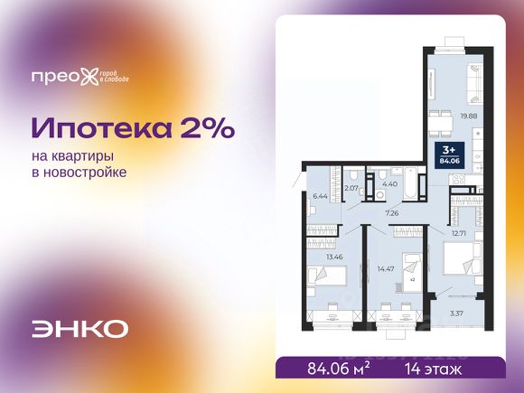 Продается 3-комн. квартира с предчистовой отделкой в ЖК "Прео" на 14 этаже. Общая площадь: 84.06 кв.м., жилая: 40.64 кв.м., площадь просторной кухни-столовой: 19.88 кв.м. Квартира - распашонка, без проходных комнат, окна выходят на paзные стороны дома. В квартире одна лоджия, один совмещенный и один раздельный санузел. Высота потолков 2.7 м.