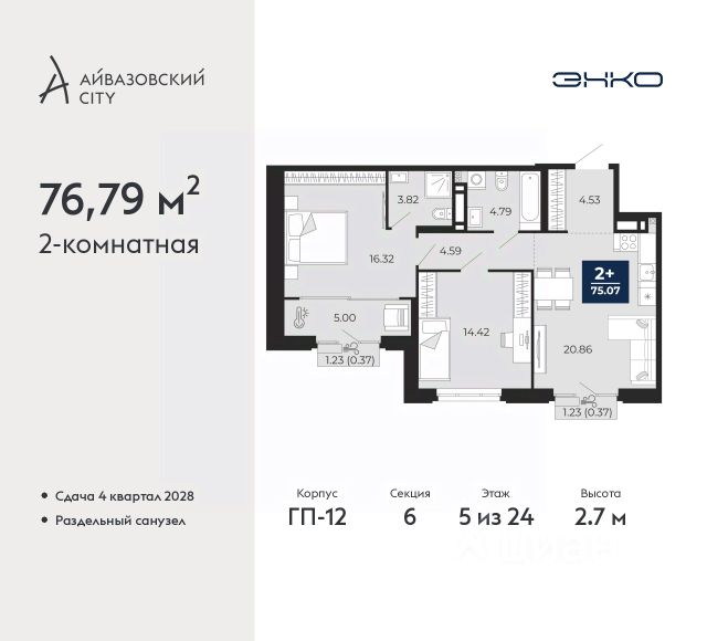 2-комн. квартира в ЖК "Айвазовский" на 5 этаже. Общая площадь: 76.79 кв.м. Высота потолков 2.7 м.