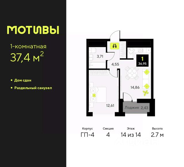 Просторная 1-комн. квартира в ЖК "Мотивы" на 14 этаже. Общая площадь: 35.85 кв.м. Высота потолков 2.7 м. Квартира предоставляется в чистовой отделке: на полу ламинат, на стенах флизелиновые обои под покраску, санузел отделан плиткой, установлена вся сантехника, краны, смесители, душевые лейки и т.д., также в комплектацию входит кондиционер, видеодомофон, вызывная панель домофона уже установлена и подключена к работе. Выбирая место для жизни, вы хотите, чтобы оно было лучше и удобнее. Мы же хотим, чтобы каждый смог получить все, что пожелает при переезде в новый дом. Это наша цель, миссия и главный мотив. Пара шагов от дома и вы оказываетесь в парке, где можно совершить утреннюю пробежку или неспешно прогуляться после рабочего дня. Подъезды в домах сквозные, а входные группы расположены на уровне тротуара - в дом удобно заходить как с улицы, так и со двора. Домофон в тёплом тамбуре не позволит вам замёрзнуть, пока вы открываете двери. А хорошее настроение обеспечат светлые холлы, оформленные в едином стиле. Больше никакой грязи в квартире. Велосипеды и коляски можно оставить в колясочных, которые мы сделали по-настоящему просторными. А обладатели четверногих друзей смогут помыть их лапки после прогулки в специально оборудованных лапомойных комнатах. Квартира с видом на бескрайний природный простор или на урбанистический пейзаж? Легко! Мы создали безопасный двор, где можно без лишних тревог оставить детей играть во дворе. Закрытая от автомобилей территория и камеры видеонаблюдения - гарант вашего спокойствия.