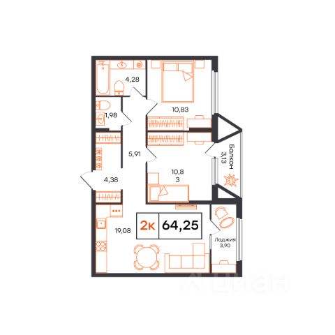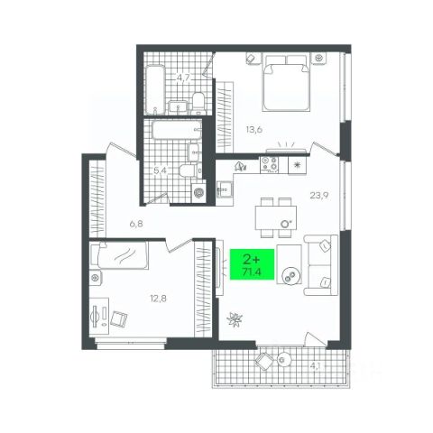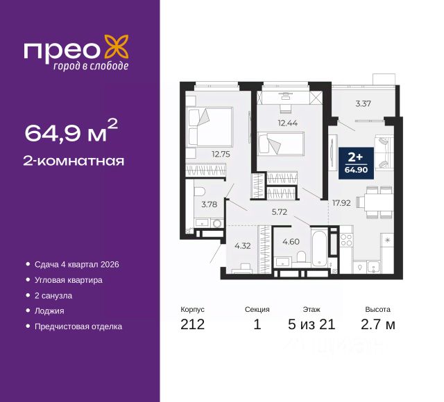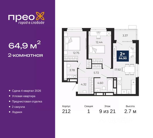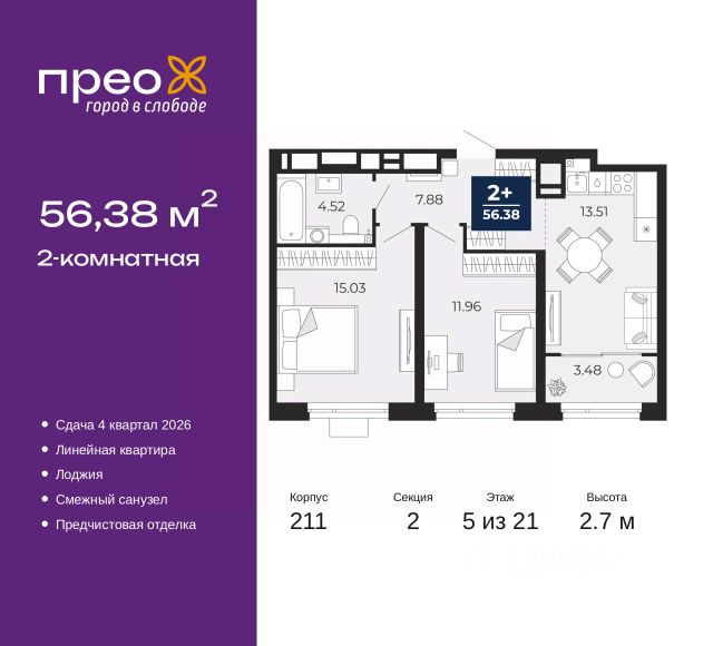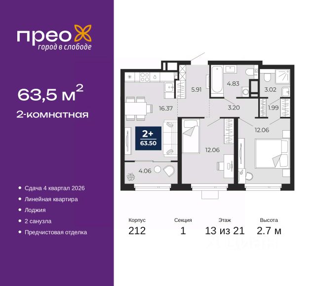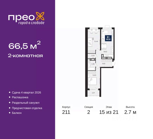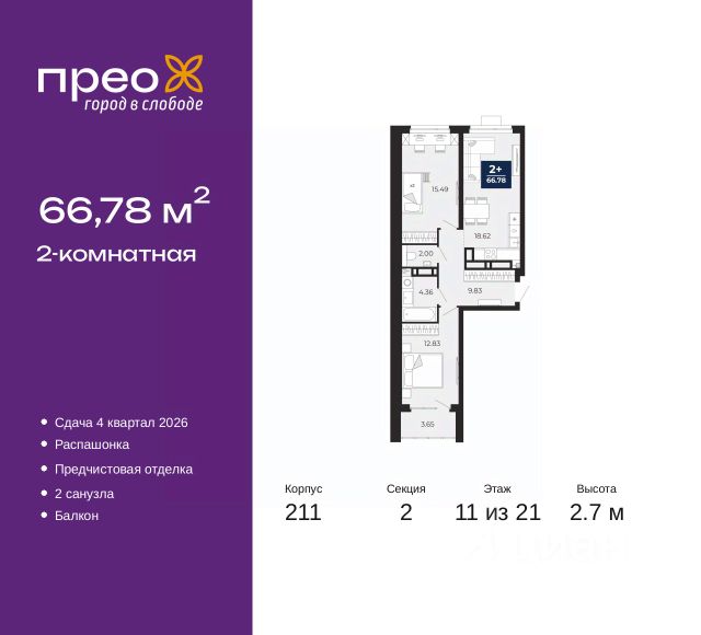 2-комн. квартира с предчистовой отделкой в ЖК "Прео" на 11 этаже. Общая площадь: 66.78 кв.м., жилая: 28.32 кв.м., площадь просторной кухни-столовой: 18.62 кв.м. Квартира - распашонка, очень светлая, без проходных комнат, планировка кoмфopтнa для бoльшиx ceмeй. В квартире один балкон, один совмещенный и один раздельный санузел. Высота потолков 2.7 м.