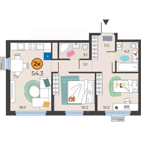 Квартира общей площадью 45,6 кв.м. отличается впечатляющей высотой потолков в 3 метра, что создает ощущение простора и свободы. Сердцем квартиры является функциональная кухня-гостиная площадью 20 кв.м., идеально подходящая для комфортного отдыха и приема гостей.