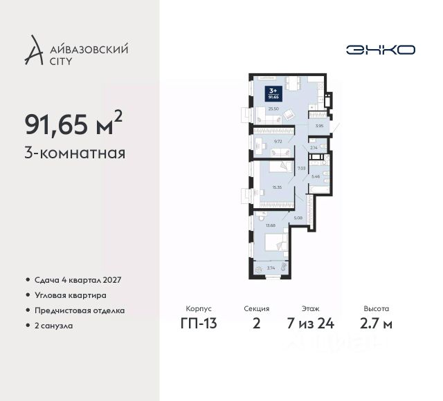 Трехкомнатная квартира с предчистовой отделкой в ЖК "Айвазовский City" на 7 этаже. Общая площадь: 91.65 кв.м., жилая: 38.75 кв.м., площадь просторной кухни-столовой: 25.5 кв.м. Угловая квартира, очень светлая, естественная вентиляция при открытии окон. В квартире один совмещенный и один раздельный санузел. Высота потолков 2.7 м. Дом монолитный, многоподъездный, высотой 24 этажа. Квартира находится во 2-й секции в корпусе ГП-13. На этаже 6 квартир. В подъезде 1 пассажирский и 1 грузовой лифт. Окончание строительства - 4 квартал 2027 года. Оформление сделки по договору долевого участия. Новый жилой район располагается в живописном месте на берегу Туры в центральной части города. Принципиально новое пространство для жизни в центре современного города для тех, чьи мечты сбываются, кто нацелен на постоянный рост, перемены к лучшему для себя и своих близких. Каждая деталь Айвазовский City вдохновляет и заряжает на новые свершения: авторская архитектура, сбалансированная продуманная инфраструктура, дизайнерские дворы со спортивными и детскими площадками, парковые зоны с фонтанами, водный канал, украшающий центральный прогулочный маршрут района и многое другое. В 2019 года проект стал лауреатом престижной премии Urban Awards 2019 в номинации "Лучший строящийся региональный жилой комплекс бизнес-класса". Главная особенность Айвазовский City - соседство разных архитектурных школ в рамках одного дома. Изысканная классика, выразительная эклектика и оригинальный модерн - жить в одном из таких домов настоящий повод для гордости. Айвазовский City это идеальное сочетание комфорта, технологий и развитой инфраструктуры. Вход в подъезд возможен с улицы и со двора. Отправляясь на работу или за покупками, жители могут выйти с внешней стороны дома, а для прогулки с ребенком со стороны двора. Экологически чистые материалы и энергосберегающие технологии, качественное освещение общественных зон, видеонаблюдение по всей территории жилого района (в том числе в подъездах, лифтах и в подземном паркинге), закрытые дворы с доступом только для жителей Айвазовский City. Часть домов в Айвазовский City будут оснащены подземным паркингом. Востребованный в нашем климатическом поясе формат хранения автомобилей защитит собственность владельца в любое время года. Аккредитация в банках: ПАО Банк "ВТБ", ПАО "Газпромбанк", "Сбербанк России", ОАО "Альфа-Банк", ПАО "Совкомбанк" и других. #ZM8a3E