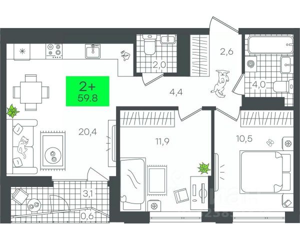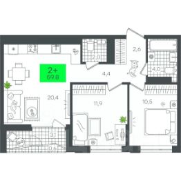 Квартира 2+ с мастер-спальней и террасой на последнем этаже. Выходы на террасу есть из кухни-гостиной и обеих спален. В одной из спален спроектирована отдельная ванная комната. В просторной прихожей можно разместить несколько мест для хранения. В кухне-гостиной предусмотрена ниша под размещение кухонного гарнитура. Терраса расширит возможности для времяпрепровождения дома, здесь можно принимать солнечные ванны, заниматься спортом на свежем воздухе, жарить барбекю и устраивать пикники летом, украшать елку и получать больше витамина D зимой. Гранд Квартал, 2-Д8.2, 15, 2, квартира 156