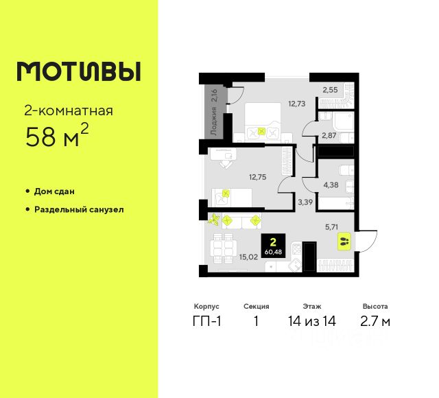 2-комн. квартира от застройщика в ЖК "Мотивы" на 12 этаже. Общая площадь: 51.2 кв.м. Высота потолков 2.7 м. Дом монолитный, двухподъездный, переменной этажности, от 12 до 14 этажей. Квартира находится во 2-й секции высотой 12 этажей в корпусе ГП-1. На этаже 12 квартир. В подъезде 1 пассажирский и 1 грузовой лифт. На сегодняшний день строительство окончено, дом сдан в 4 квартале 2024 года. Оформление сделки по договору купли-продажи. Закрытая от автомобилей территория, безопасный двор и камеры видеонаблюдения - гаранты вашего спокойствия. Квартал будет располагать богатой инфраструктурой: на первых этажах разместятся магазины, пекарни, кофейни, пункты выдачи, аптеки, детские центры, цветочные салоны и многое другое, что сделает жизнь поистине комфортной. Рядом находится парк общей площадью почти 5000 м², в котором располагаются локации для игр и отдыха жителей, здесь можно совершить утреннюю пробежку или прогуляться после рабочего дня. В парке есть зона воркаута с тренажерами для взрослых, игровые комплексы с горками и канатный комплекс для детей разных возрастов, качели и лавочки для отдыха, площадки для командных видов спорта и для панна-футбола. В ЖК "Мотивы" всё продумано до мелочей: светлые холлы входных групп, оформленные в едином стиле, просторные колясочные, лапомойки для питомцев. На территории комплекса находятся 2 8-ми этажных паркинга и более 1000 м/м на открытой парковке. Жилой комплекс находится в одном из экологически благоприятных районов Тюмени, недалеко от Плехановского бора. При этом до центра города можно добраться за 15 минут, а до международного аэропорта Рощино за 13 минут. Окончание строительства: ГП 1, 2, 3, 4 сдача до конца 2024 года, ГП 6, 7, 8 сдача 2 квартал 2026 года. #ZmDw75