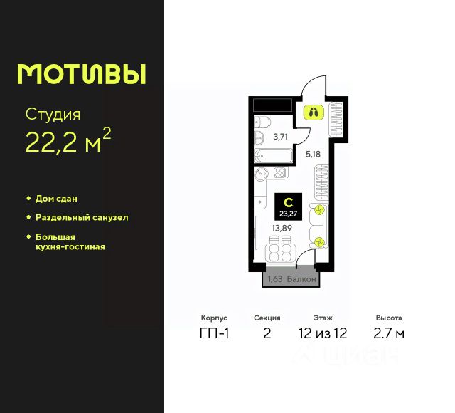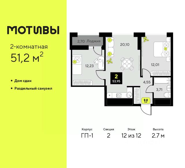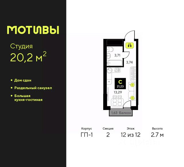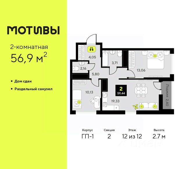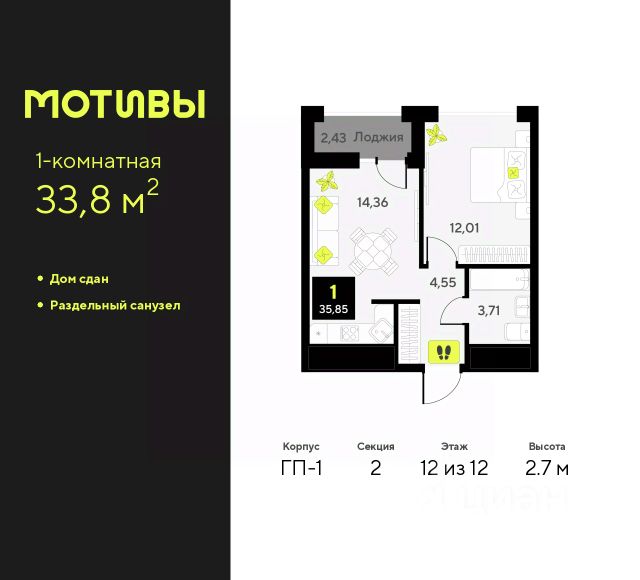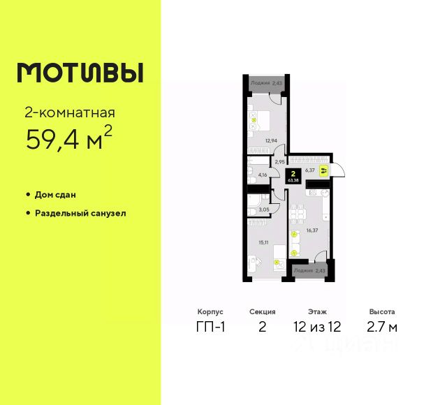 2-комн. квартира в ЖК "Мотивы" на 12 этаже. Общая площадь: 58.2 кв.м. Высота потолков 2.7 м. Дом монолитный, двухподъездный, переменной этажности, от 12 до 14 этажей. Квартира находится во 2-й секции высотой 12 этажей в корпусе ГП-1. На этаже 12 квартир. В подъезде 1 пассажирский и 1 грузовой лифт. В настоящее время строительство окончено, дом сдан в 4 квартале 2024 года. Оформление сделки по договору купли-продажи. Закрытая от автомобилей территория, безопасный двор и камеры видеонаблюдения - гаранты вашего спокойствия. Квартал будет располагать богатой инфраструктурой: на первых этажах разместятся магазины, пекарни, кофейни, пункты выдачи, аптеки, детские центры, цветочные салоны и многое другое, что сделает жизнь поистине комфортной. Рядом находится парк общей площадью почти 5000 м², в котором располагаются локации для игр и отдыха жителей, здесь можно совершить утреннюю пробежку или прогуляться после рабочего дня. В парке есть зона воркаута с тренажерами для взрослых, игровые комплексы с горками и канатный комплекс для детей разных возрастов, качели и лавочки для отдыха, площадки для командных видов спорта и для панна-футбола. В ЖК "Мотивы" всё продумано до мелочей: светлые холлы входных групп, оформленные в едином стиле, просторные колясочные, лапомойки для питомцев. На территории комплекса находятся 2 8-ми этажных паркинга и более 1000 м/м на открытой парковке. Жилой комплекс находится в одном из экологически благоприятных районов Тюмени, недалеко от Плехановского бора. При этом до центра города можно добраться за 15 минут, а до международного аэропорта Рощино за 13 минут. Окончание строительства: ГП 1, 2, 3, 4 сдача до конца 2024 года, ГП 6, 7, 8 сдача 2 квартал 2026 года. #ZmDW76