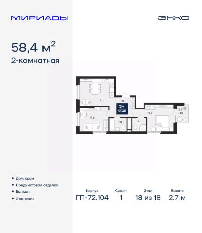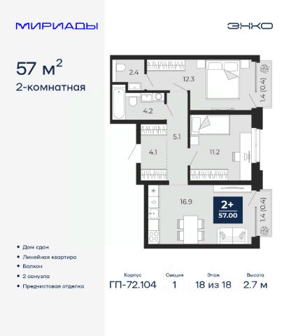 Однокомнатная квартира-студия с предчистовой отделкой в ЖК "Мириады" на 18 этаже. Общая площадь: 34.1 кв.м., площадь гостиной 21.9 кв.м., из которых 11.7 кв.м. выделено под кухонную зону. Угловая квартира, очень светлая, естественная вентиляция при открытии окон. В квартире один балкон, один совмещенный санузел. Высота потолков 2.7 м. Дом монолитный, двухподъездный, переменной этажности, от 14 до 18 этажей. Квартира находится в 1-й секции высотой 18 этажей в корпусе ГП-72.104. На этаже 6 квартир. В подъезде 1 пассажирский и 1 грузовой лифт. Строительство окончено, дом сдан в 4 квартале 2025 года. Оформление сделки по договору купли-продажи. Вселенная бесконечных историй. Ранее невиданный Тюмени масштаб: территория 240 гектаров и 1 650 000 м² застройки. Мириады это город масштабных перемен и больших возможностей. Город зеленых рощ и зеркальных озер. Город для работы, учебы и развлечений. Город для детей и их родителей. Город для всех и каждого. Проект расположен в районе Мыс рядом с ТРЦ "Тюмень Сити Молл" в границах улицы Тимофея Чаркова, Тобольского тракта и объездной дороги. Срок полного освоения территории - до 2034 года. #ZMb4WB