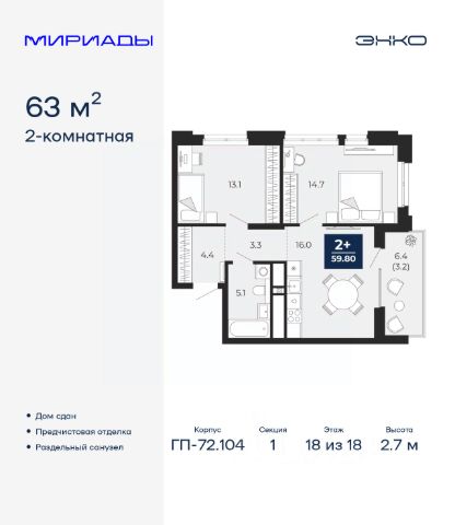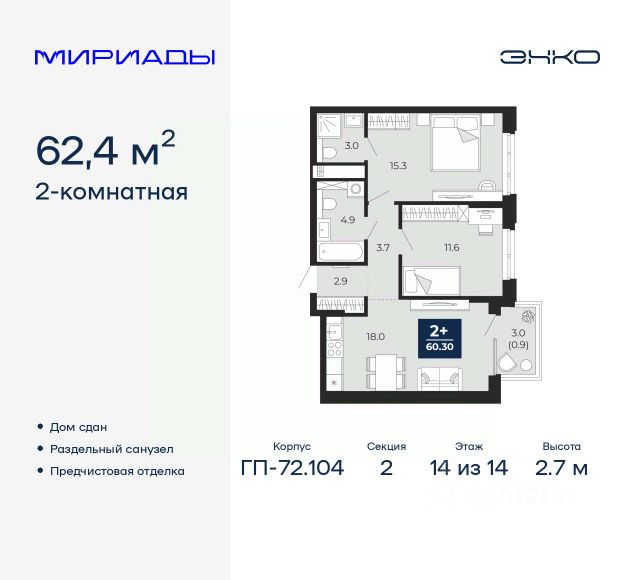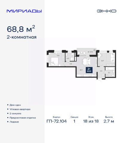 Продается 1-комн. квартира от застройщика с предчистовой отделкой в ЖК "Мириады" на 14 этаже. Общая площадь: 44.3 кв.м. Высота потолков 2.7 м. Дом монолитный, двухподъездный, переменной этажности, от 14 до 18 этажей. Квартира находится во 2-й секции высотой 14 этажей в корпусе ГП-72.104. На этаже 8 квартир. В подъезде 1 пассажирский и 1 грузовой лифт. Строительство завершено, дом сдан в 4 квартале 2025 года. Оформление сделки по договору купли-продажи. Вселенная бесконечных историй. Ранее невиданный Тюмени масштаб: территория 240 гектаров и 1 650 000 м² застройки. Мириады это город масштабных перемен и больших возможностей. Город зеленых рощ и зеркальных озер. Город для работы, учебы и развлечений. Город для детей и их родителей. Город для всех и каждого. Проект расположен в районе Мыс рядом с ТРЦ "Тюмень Сити Молл" в границах улицы Тимофея Чаркова, Тобольского тракта и объездной дороги. Срок полного освоения территории - до 2034 года. #Z7OZwC