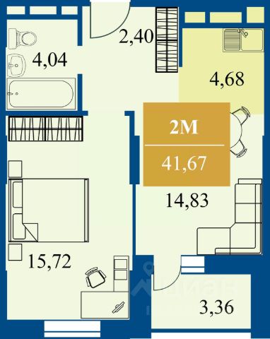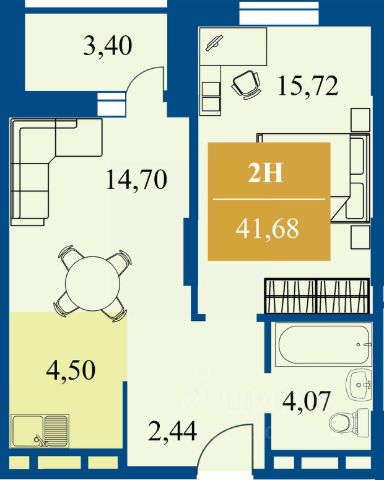 квартира формата "1+": кухня-гостиная и спальная комната. Комфортная