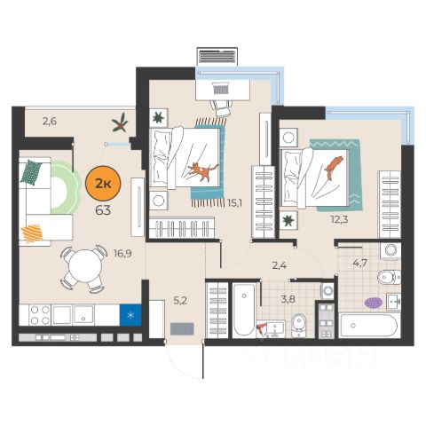Планировка — распашонка с просторной кухней-гостиной (15 м²), тремя изолированными спальнями и уютной гостиной-зоной отдыха.
