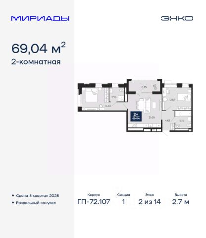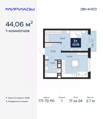Спешите оформить бронирование на этих условиях, срок акции ограничен! Стоимость квартиры указана со скидкой, ваша экономия составит 307,000 руб. Информация по телефону, наши менеджеры вам все расскажут. Однокомнатная квартира в ЖК "Мириады" на 13 этаже. Общая площадь: 40.74 кв.м. Высота потолков 2.7 м. Дом монолитный, двухподъездный, переменной этажности, от 14 до 16 этажей. Квартира находится во 2-й секции высотой 16 этажей в корпусе ГП-72.107. На этаже 10 квартир. В подъезде 1 пассажирский и 1 грузовой лифт. Окончание строительства - 3 квартал 2028 года. Оформление сделки по договору долевого участия. Вселенная бесконечных историй. Ранее невиданный Тюмени масштаб: территория 240 гектаров и 1 650 000 м² застройки. Мириады это город масштабных перемен и больших возможностей. Город зеленых рощ и зеркальных озер. Город для работы, учебы и развлечений. Город для детей и их родителей. Город для всех и каждого. Проект расположен в районе Мыс рядом с ТРЦ "Тюмень Сити Молл" в границах улицы Тимофея Чаркова, Тобольского тракта и объездной дороги. Срок полного освоения территории - до 2034 года. #ZMdDFB Купить квартиру в новостройке без отделки в Тюменской области.