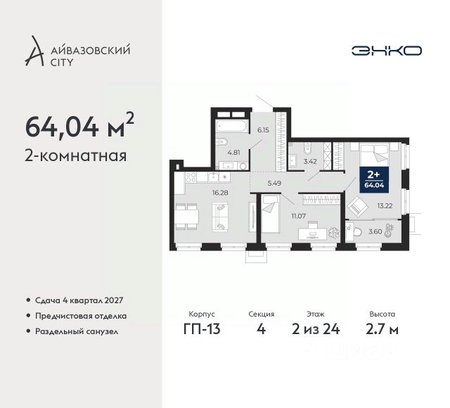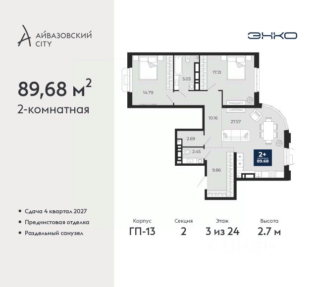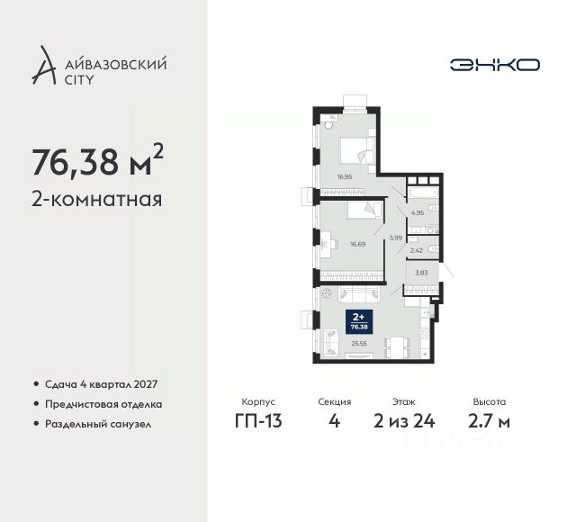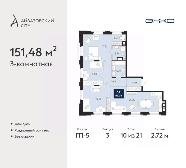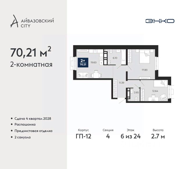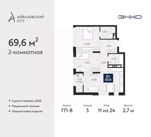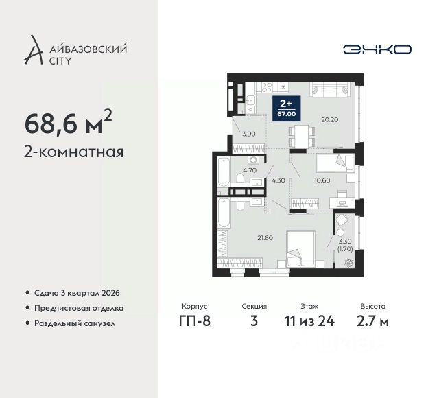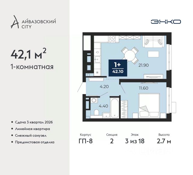 Продается однокомнатная квартира с предчистовой отделкой в ЖК "Айвазовский" на 3 этаже. Общая площадь: 42.1 кв.м., жилая: 11.6 кв.м., площадь просторной кухни-столовой: 21.9 кв.м. Все окна выходят на одну сторону. В квартире один совмещенный санузел. Высота потолков 2.7 м. Дом монолитный, многоподъездный, переменной этажности, от 14 до 24 этажей. Квартира находится в 4-й секции высотой 18 этажей в корпусе ГП-8. На этаже 6 квартир. В подъезде 1 пассажирский и 1 грузовой лифт. Окончание строительства - 3 квартал 2026 года. Оформление сделки по договору долевого участия. Новый жилой район располагается в живописном месте на берегу Туры в центральной части города. Принципиально новое пространство для жизни в центре современного города для тех, чьи мечты сбываются, кто нацелен на постоянный рост, перемены к лучшему для себя и своих близких. Каждая деталь ЖК "Айвазовский" вдохновляет и заряжает на новые свершения: авторская архитектура, сбалансированная продуманная инфраструктура, дизайнерские дворы со спортивными и детскими площадками, парковые зоны с фонтанами, водный канал, украшающий центральный прогулочный маршрут района и многое другое. В 2019 года проект стал лауреатом престижной премии Urban Awards 2019 в номинации "Лучший строящийся региональный жилой комплекс бизнес-класса". Главная особенность Айвазовский - соседство разных архитектурных школ в рамках одного дома. Изысканная классика, выразительная эклектика и оригинальный модерн - жить в одном из таких домов настоящий повод для гордости. Айвазовский это идеальное сочетание комфорта, технологий и развитой инфраструктуры. Вход в подъезд возможен с улицы и со двора. Отправляясь на работу или за покупками, жители могут выйти с внешней стороны дома, а для прогулки с ребенком со стороны двора. Экологически чистые материалы и энергосберегающие технологии, качественное освещение общественных зон, видеонаблюдение по всей территории жилого района (в том числе в подъездах, лифтах и в подземном паркинге), закрытые дворы с доступом только для жителей Айвазовский. Часть домов в Айвазовский будут оснащены подземным паркингом. Востребованный в нашем климатическом поясе формат хранения автомобилей защитит собственность владельца в любое время года. Аккредитация в банках: ПАО "Газпромбанк", "Сбербанк России", ОАО "Альфа-Банк", ПАО Банк "ВТБ", ПАО Банк "ФК Открытие" и других. #2MFFTM Квартира в доме бизнес класса.