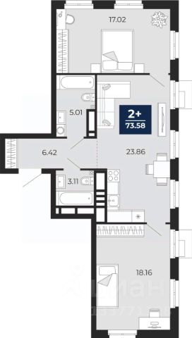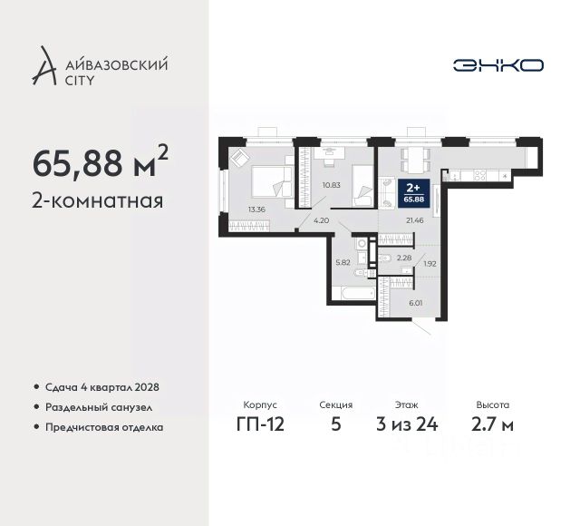 Просторная двухкомнатная квартира с предчистовой отделкой в ЖК "Айвазовский" на 2 этаже. Общая площадь: 90.06 кв.м., жилая: 42.88 кв.м., площадь просторной кухни-столовой: 23.18 кв.м. Квартира угловая, очень светлая, естественная вентиляция при открытии окон. В квартире одна лоджия, два совмещенных санузла. Высота потолков 2.72 м.