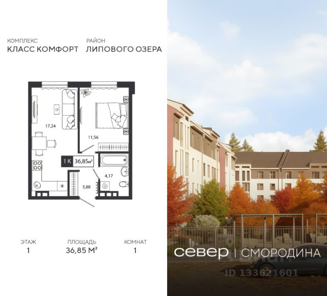 Продаётся квартира площадью 36.85 м2 в жилом комплексе "Смородина". Квартира находится на 1 этаже, жилая площадь квартиры 11.56 м2, площадь просторной кухни — 17.24 м2. Среди особенностей планировки — изолированные комнаты с окнами на одну сторону, 1 совмещённый санузел. Срок сдачи — IV кв. 2026 Жилой комплекс "Смородина" — это: - уютный малоэтажный комплекс в районе ММС - дома высотой 4 этажа - квартиры от студий до семейных вариантов с отапливаемыми лоджиями - экологичные материалы в благоустройстве территории Окружение В 5 минутах ходьбы от проекта — озеро Липовое с песчаным пляжем и лесопарковая зона. Инфраструктура В шаговой доступности есть все для комфортной жизни: школы, детские сады, магазины и аптеки. Рядом с проектом — остановка общественного транспорта. Благоустройство Прямо во дворе — собственные грядки для жителей, где можно выращивать зелень и цветы. Для детей оборудованы детские площадки из натуральных материалов. Лобби Вдохновленные современными тенденциями наши парадные разработаны с акцентом на эстетическую привлекательность и практичность. Использование натуральных материалов и ярких цветовых акцентов создает атмосферу уюта и стиля. Планировки Среди многообразия продуманных планировок есть и уютные студии, и просторные семейные варианты. Во всех квартирах предусмотрены отапливаемые лоджии, где можно устроить зону отдыха или рабочий кабинет. Продам квартиру в новостройке с отделкой в округе Центральный в городе Тюмень.